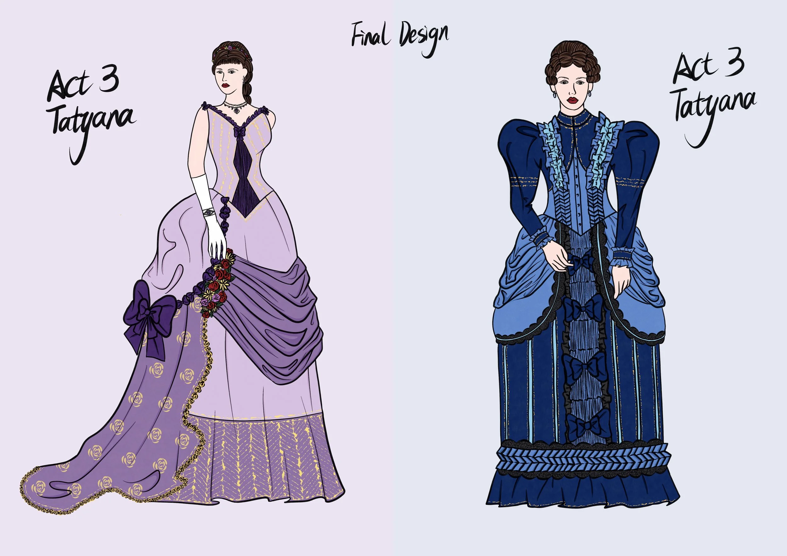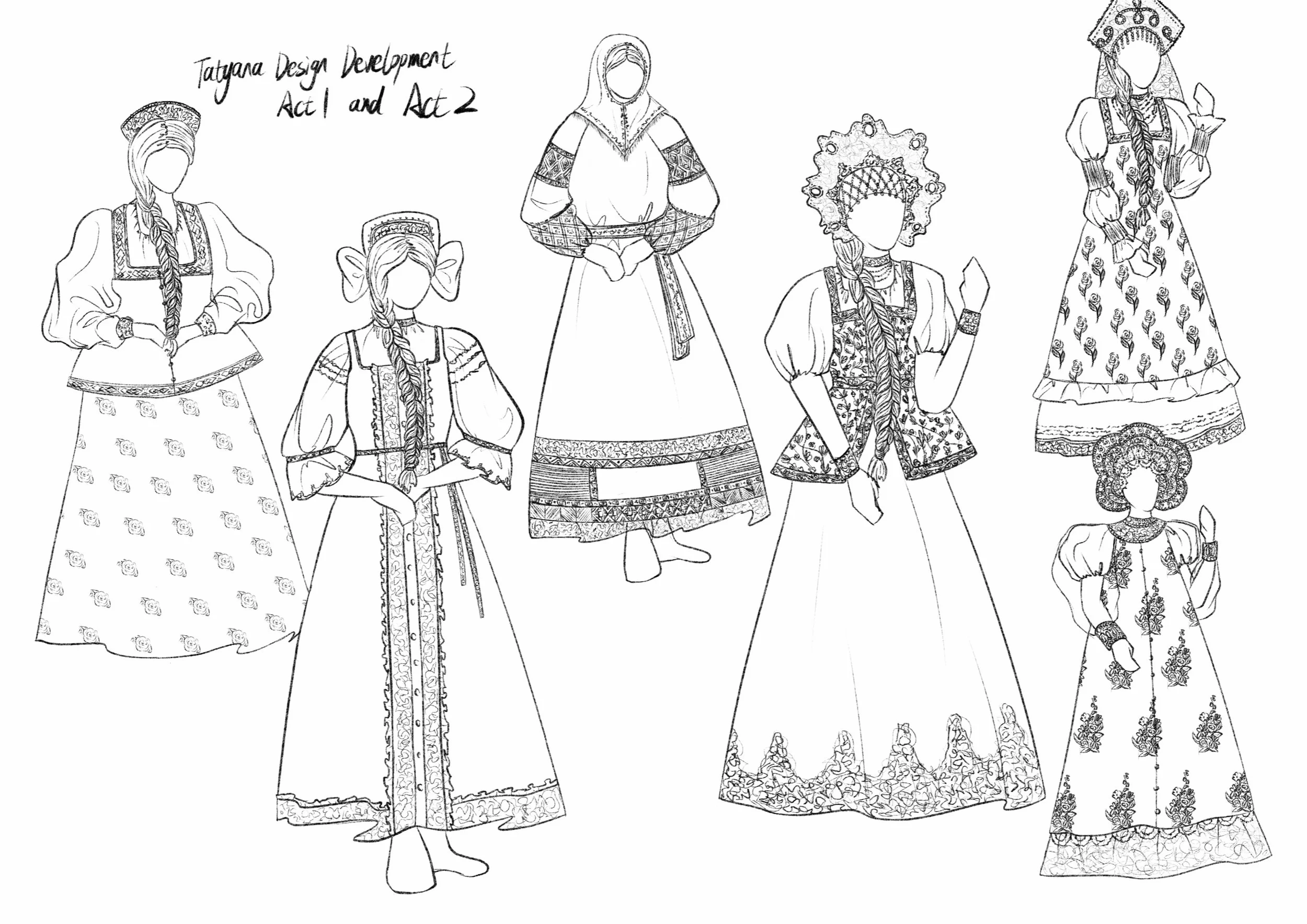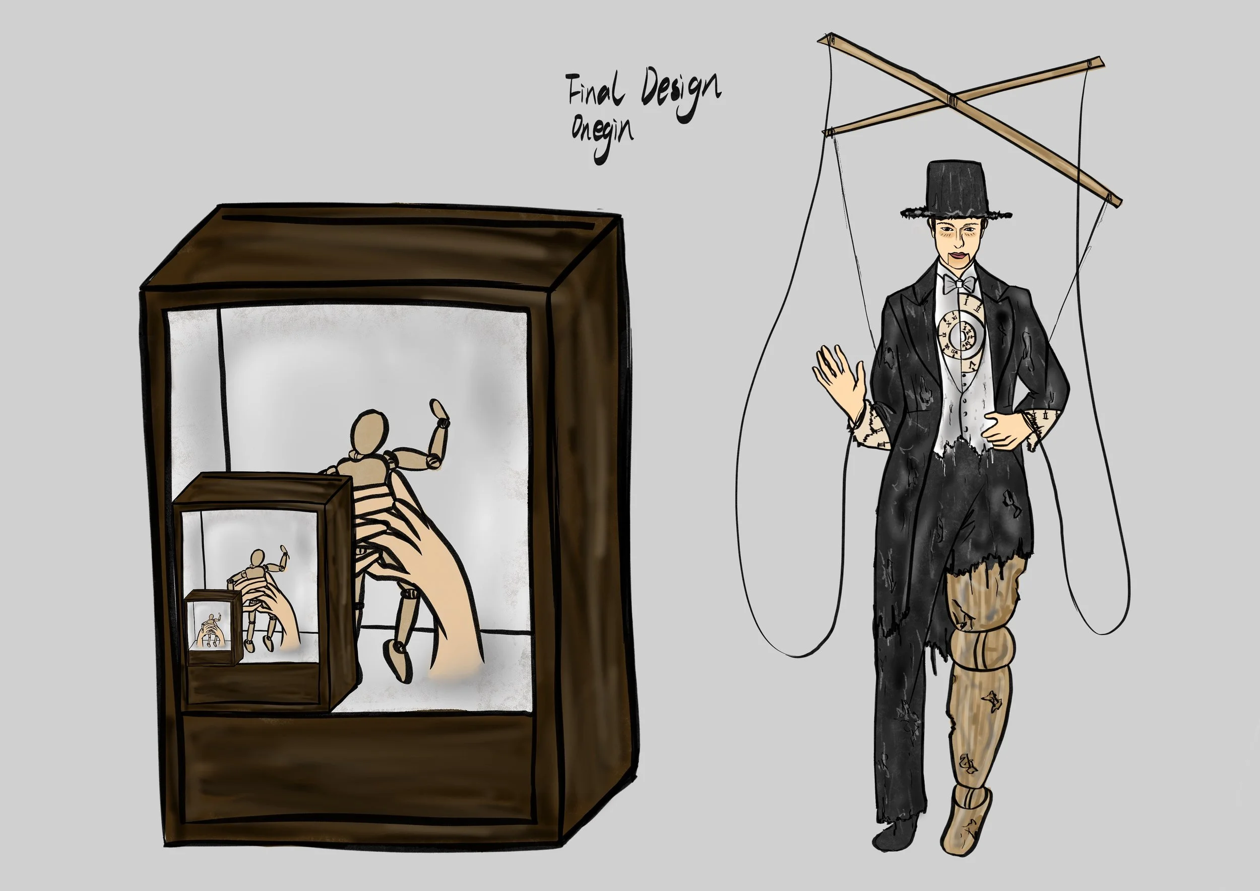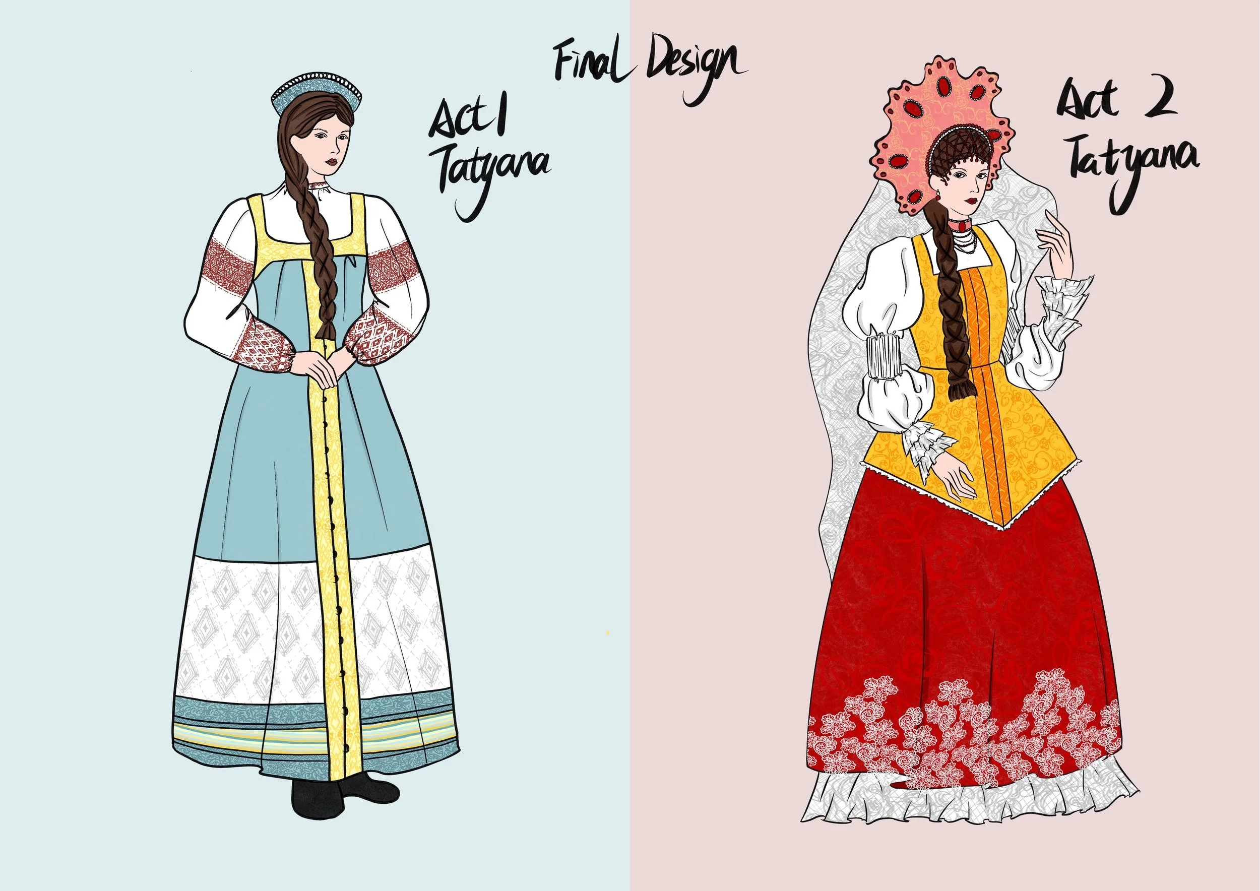 Eugene Onegin is set in 19th century Russia. My designs are based on this and are centred around traditional Russian clothing and 19th century fashion with some romantic elements. Onegin's designs are unique in that he is inspired by a puppet who is manipulated to keep reincarnating his experiences, where the end of the story is the beginning.