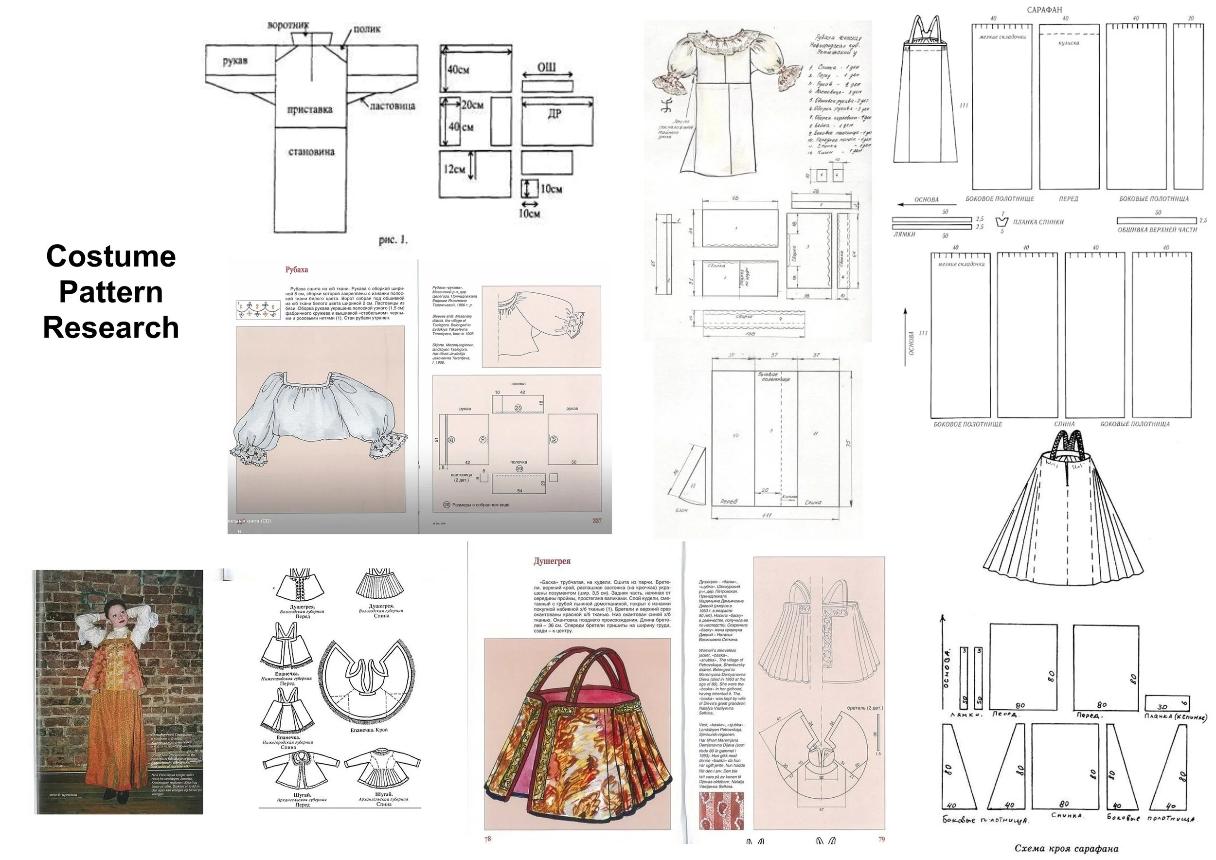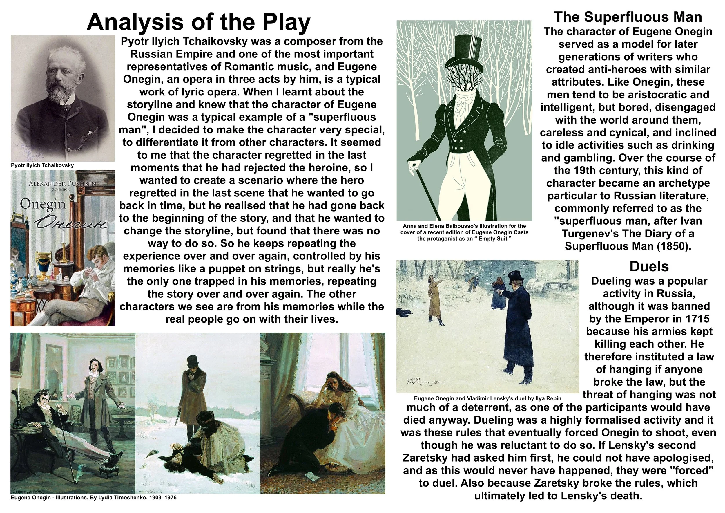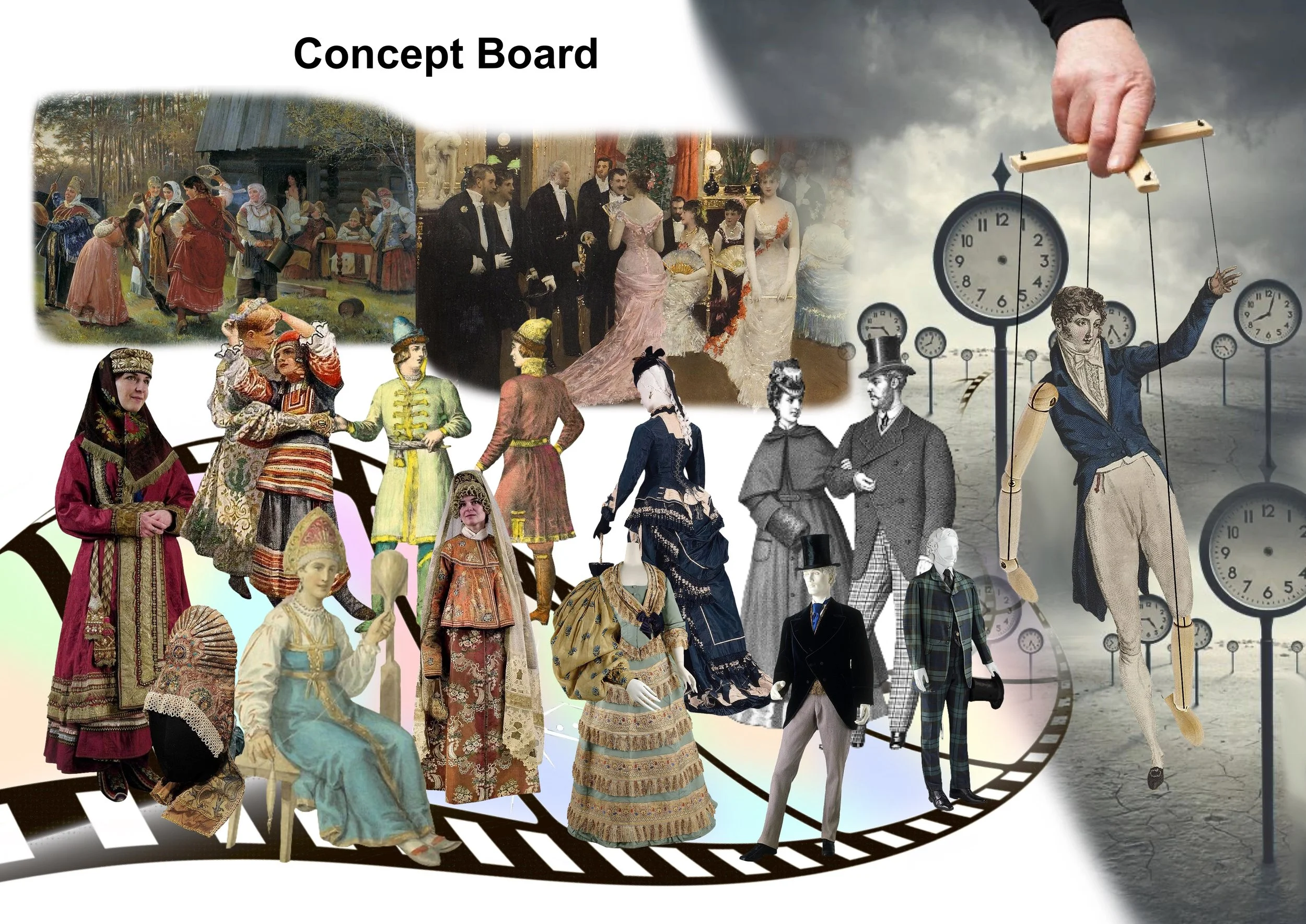 Eugene Onegin is set in 19th century Russia. My designs are based on this and are centred around traditional Russian clothing and 19th century fashion with some romantic elements. Onegin's designs are unique in that he is inspired by a puppet who is manipulated to keep reincarnating his experiences, where the end of the story is the beginning.