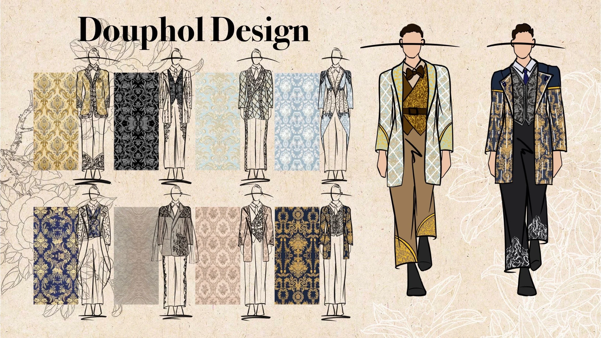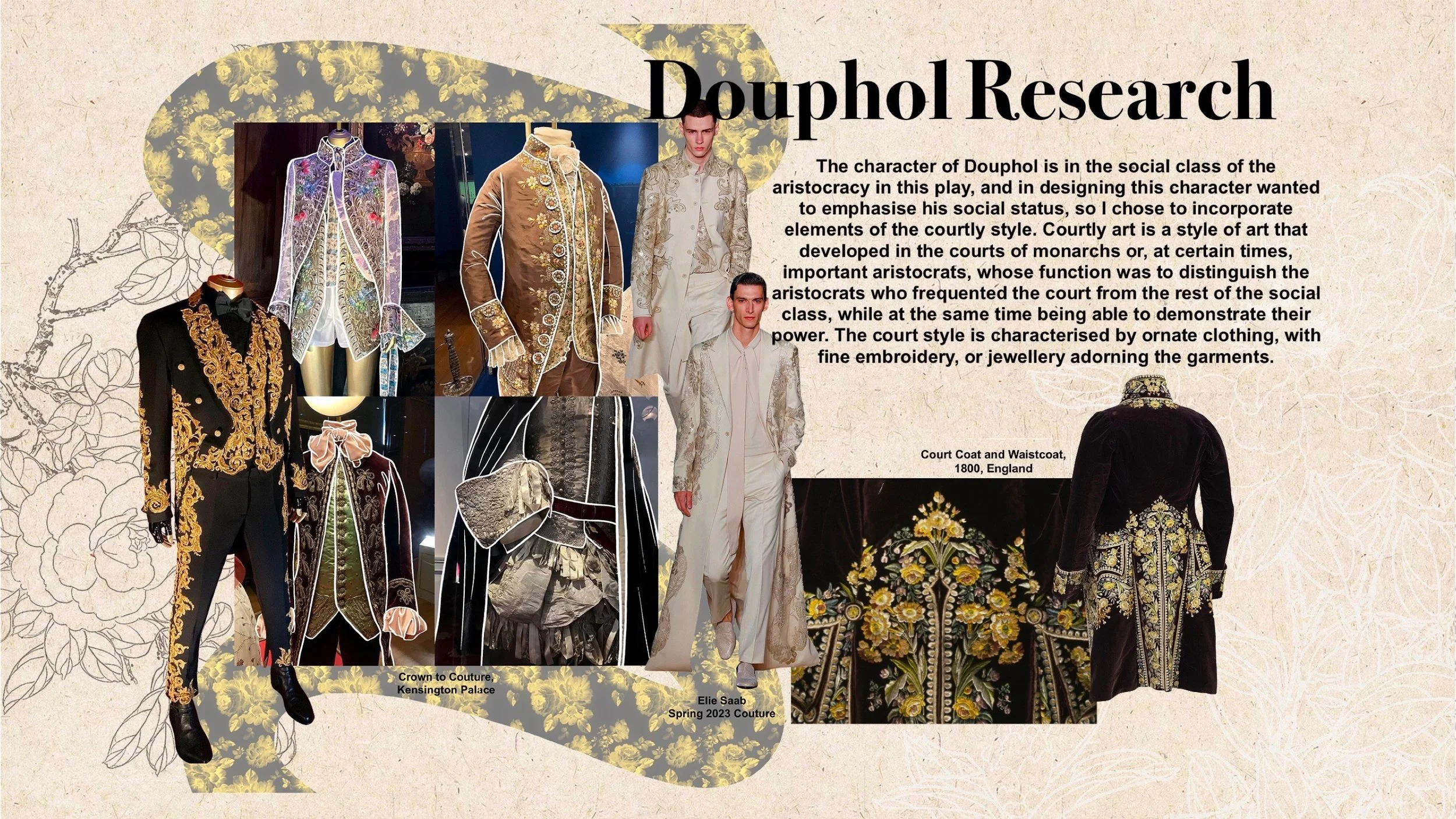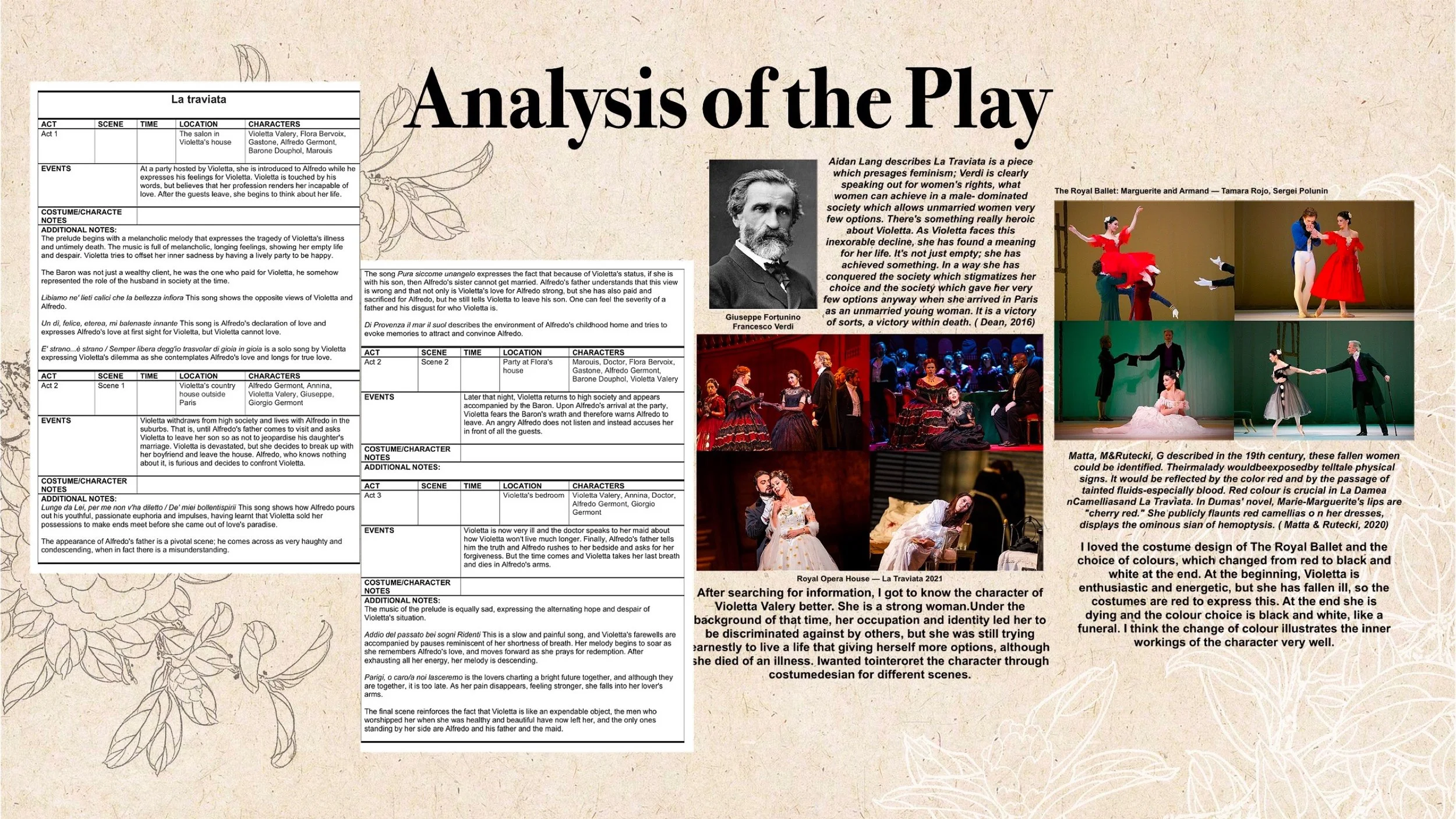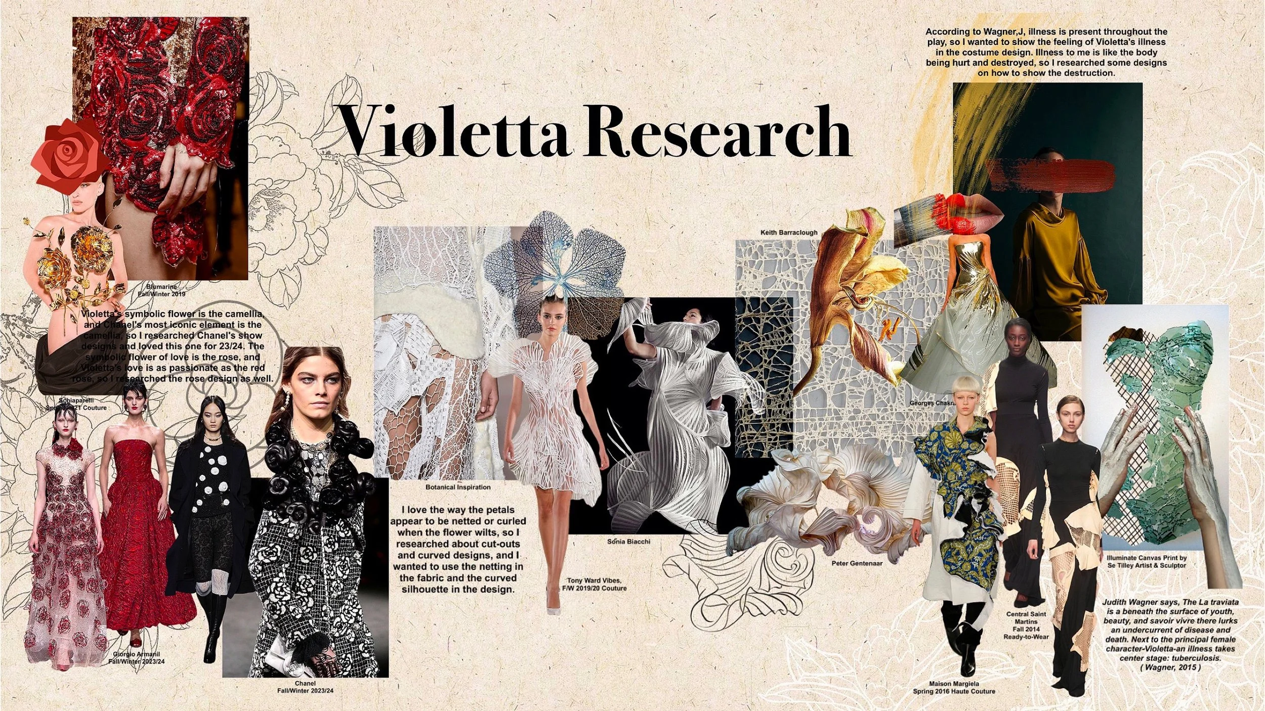 I designed 3 characters for La Traviata. Violetta was inspired by flowers and destruction; Alfredo was inspired by the Romantic period and designed some fabric patterns with the works of his contemporaries; and Douphol is predominantly noble in order to emphasise class. A series of designs were developed with the 1950's fashion in mind, and Violetta's Costume was made, incorporating 3D technology.