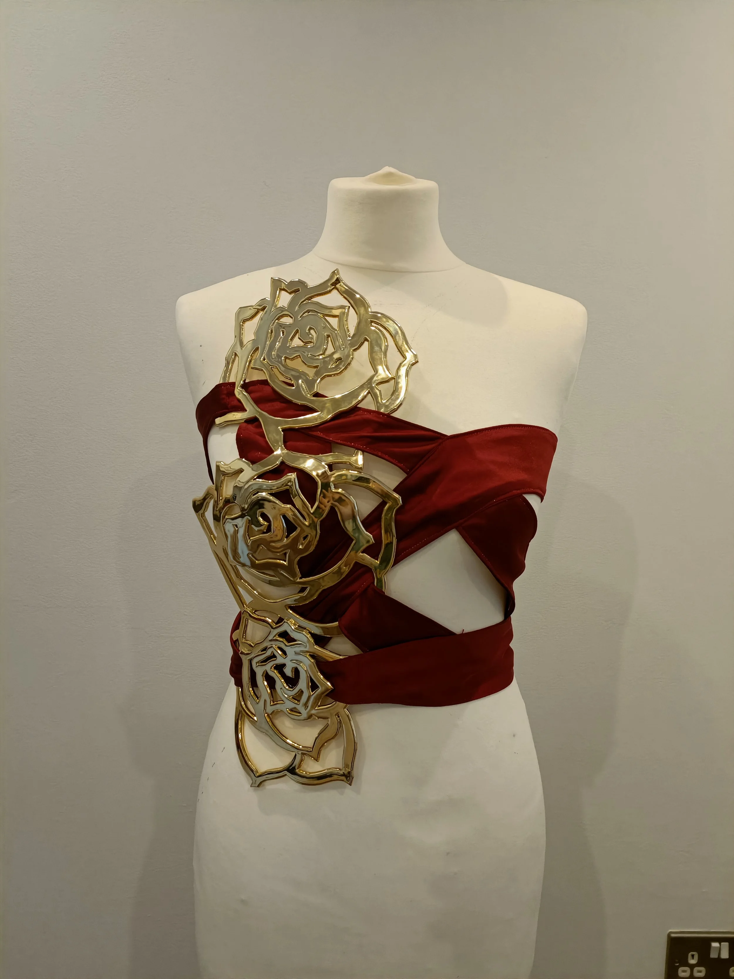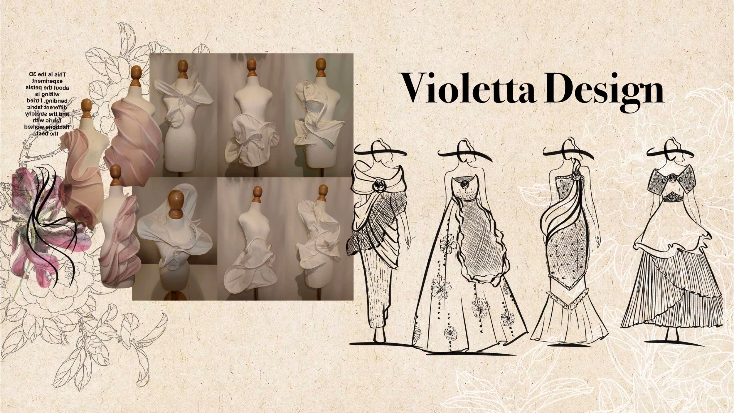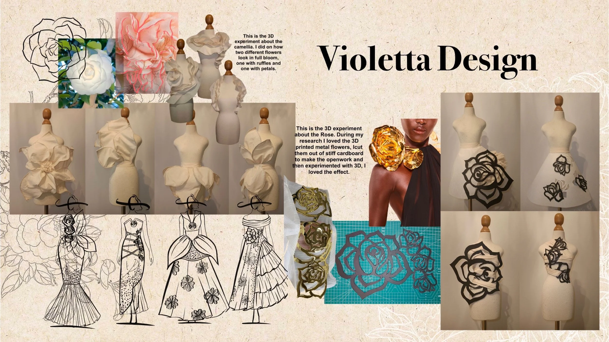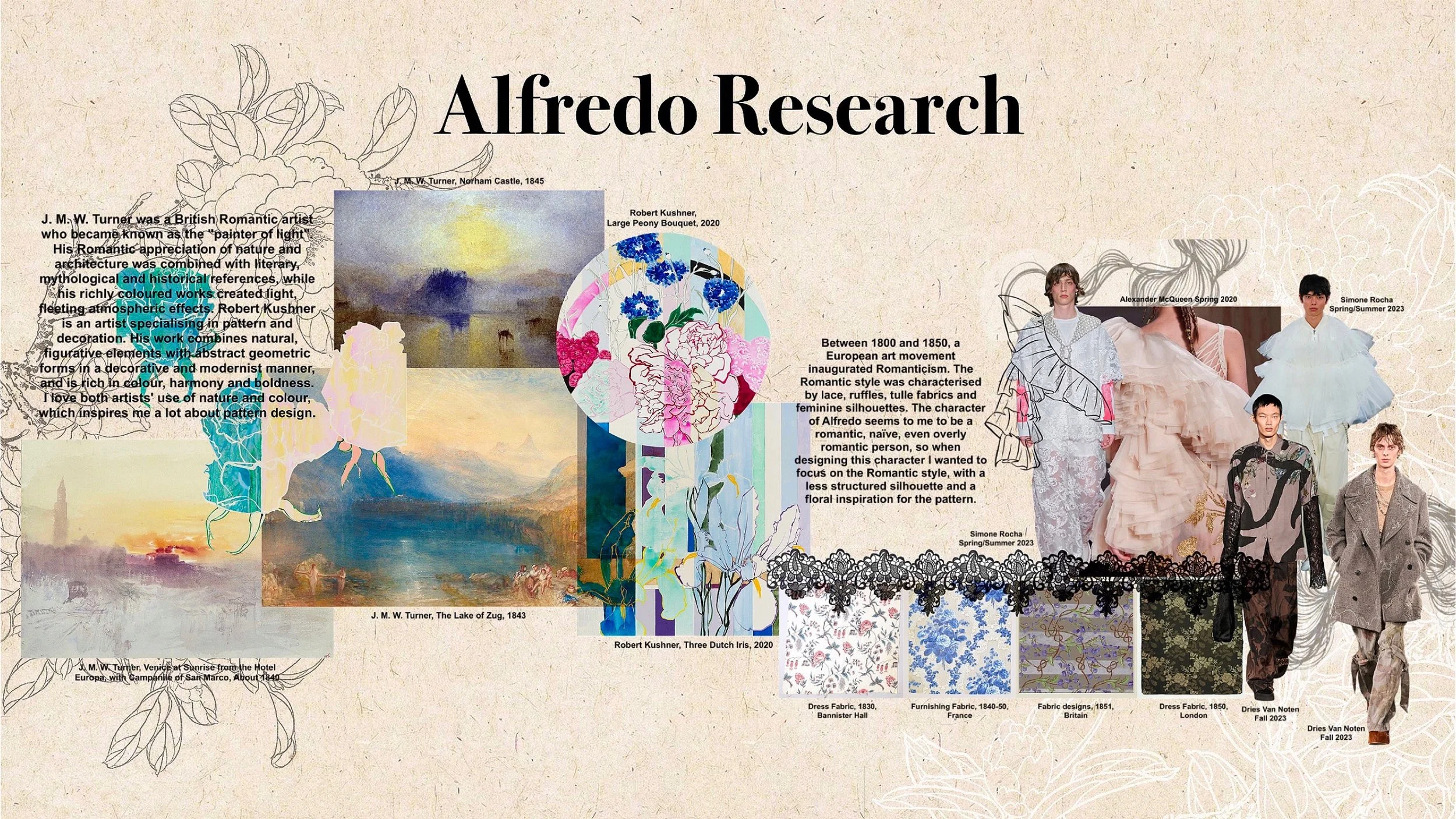 I designed 3 characters for La Traviata. Violetta was inspired by flowers and destruction; Alfredo was inspired by the Romantic period and designed some fabric patterns with the works of his contemporaries; and Douphol is predominantly noble in order to emphasise class. A series of designs were developed with the 1950's fashion in mind, and Violetta's Costume was made, incorporating 3D technology.
