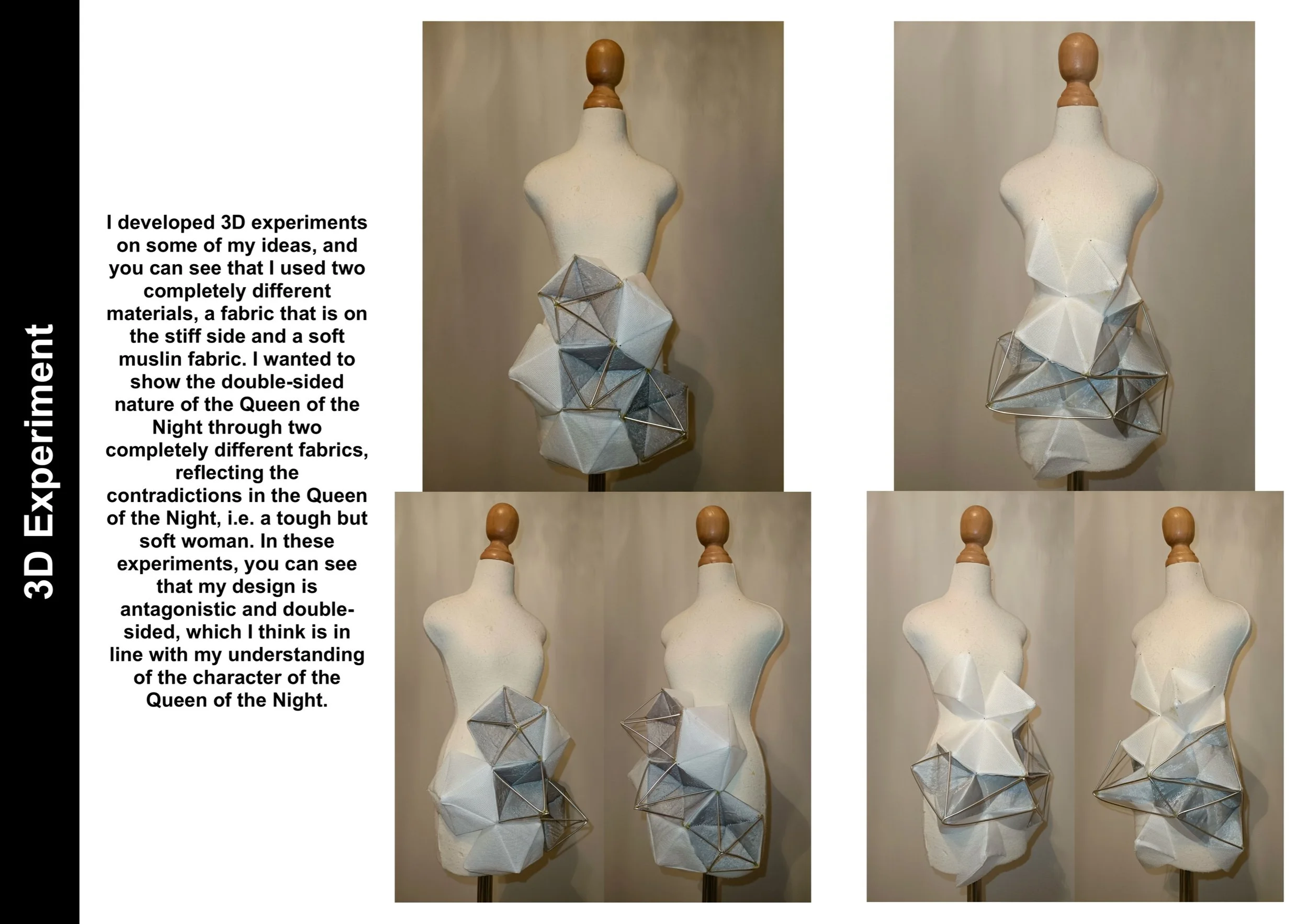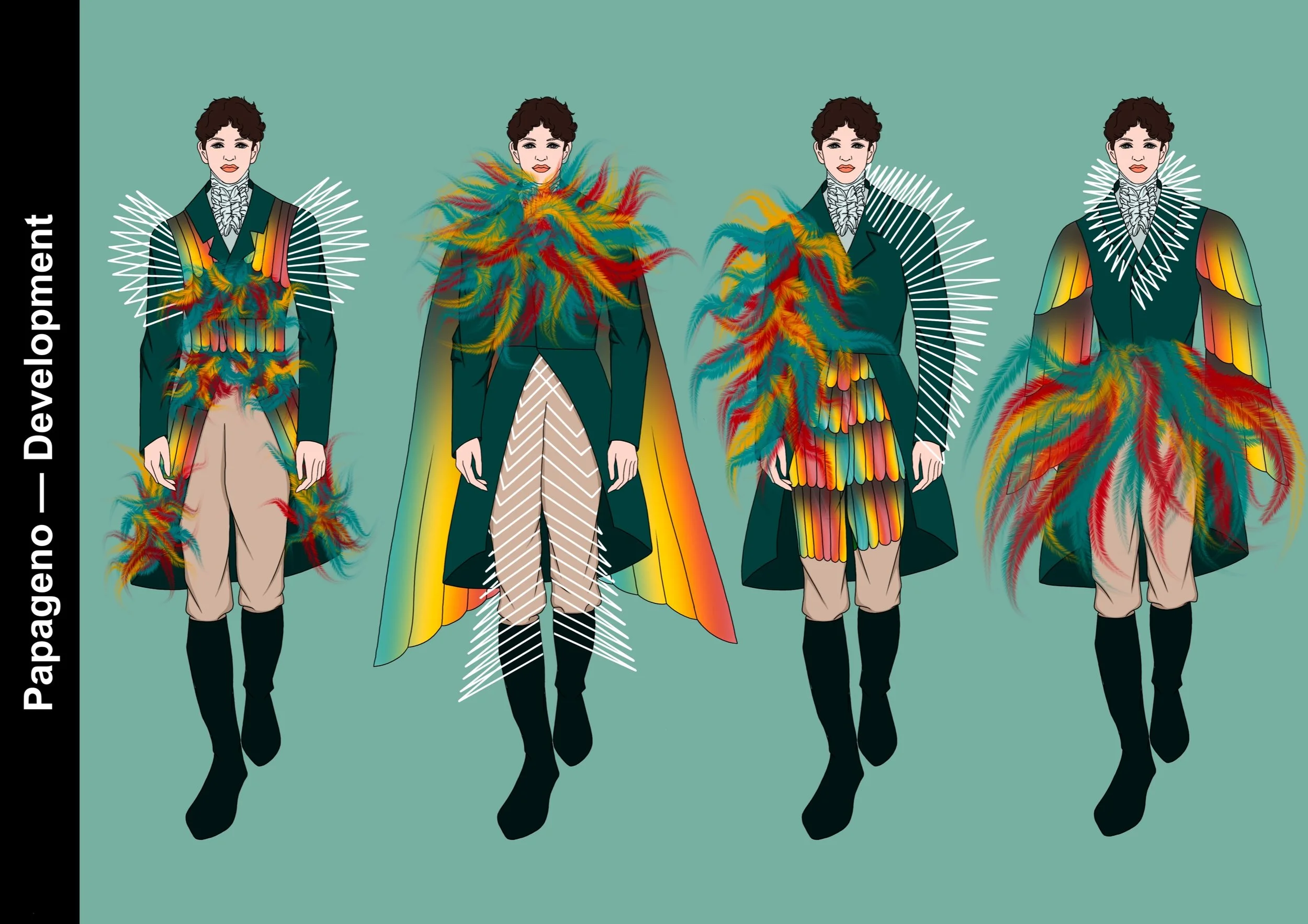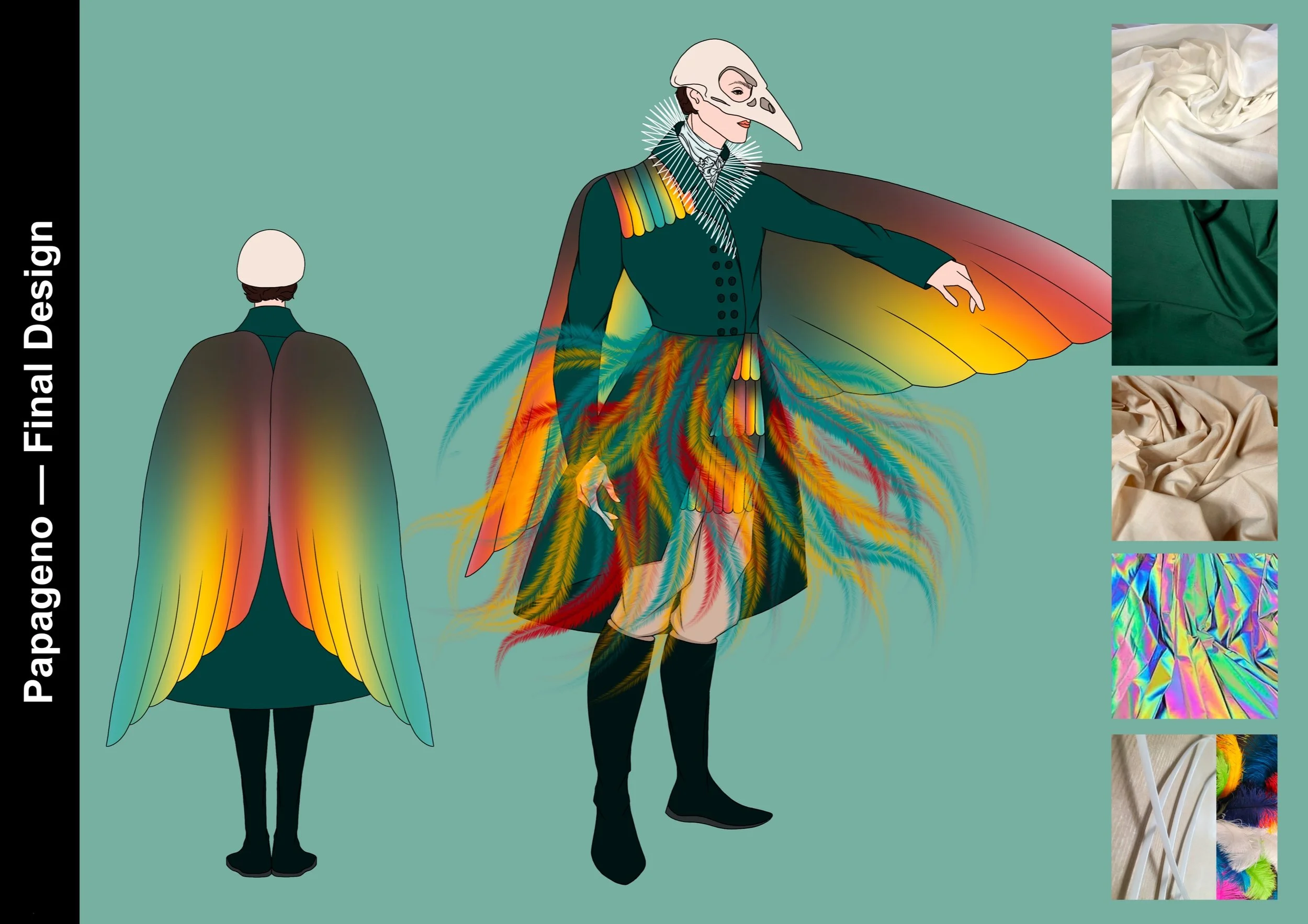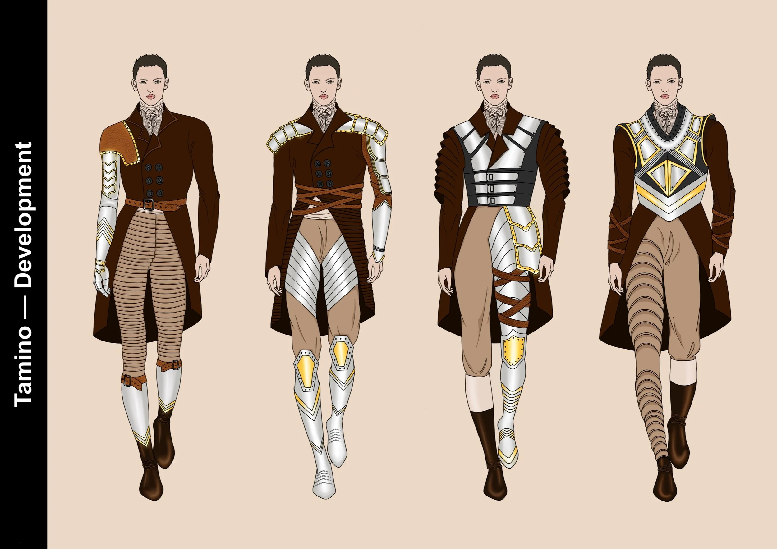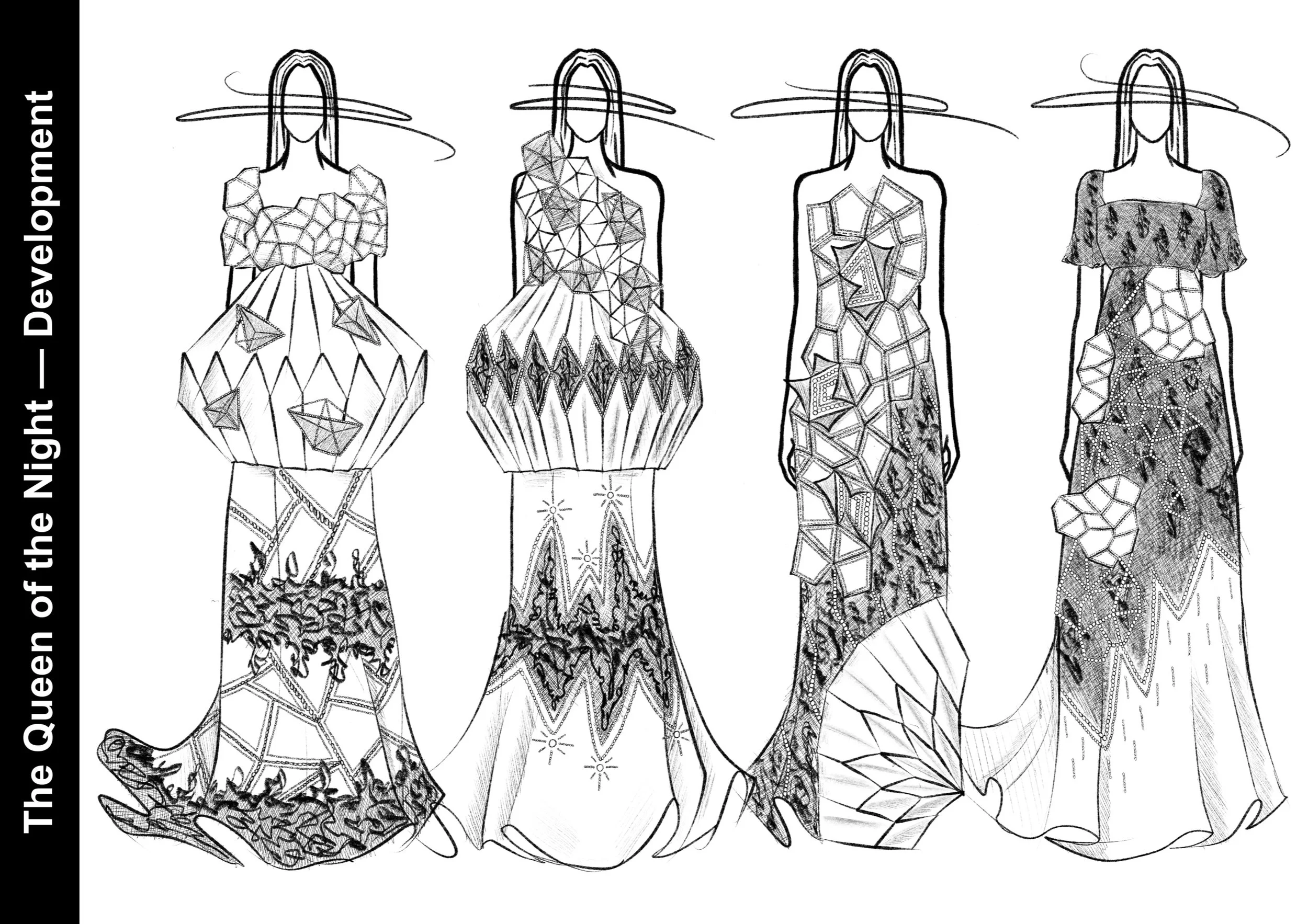 I designed the 5 characters in The Magic Flute. The Queen of the Night was inspired by diamonds illuminated by light in the darkness; Sarastro was inspired by Architectural Geometry; Tamino was Armour; and Papagene and Papagena were inspired by birds. Aseries of designs have been developed in conjunction with the Neoclassicism of fashion, and the production of The Queen of the Night's Costume.