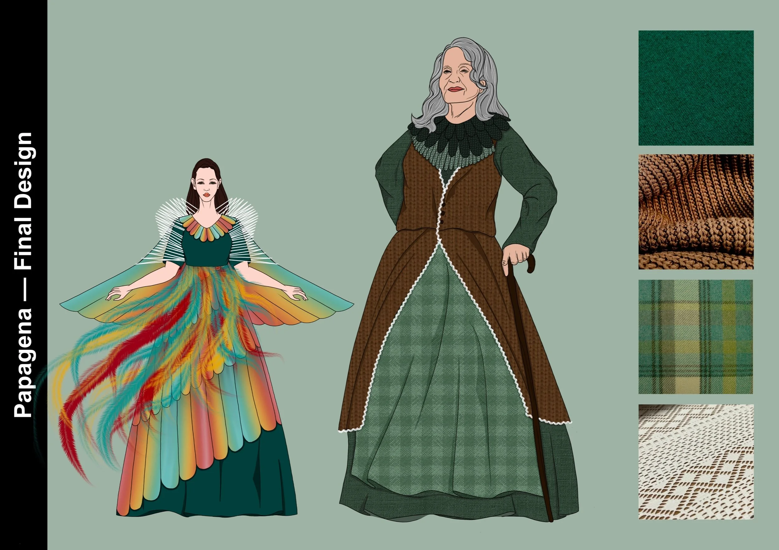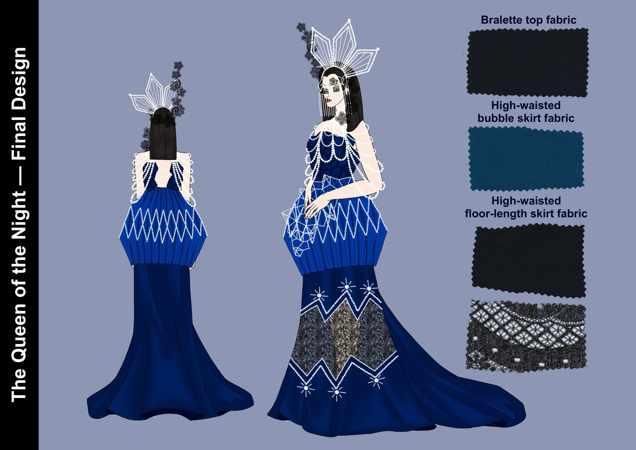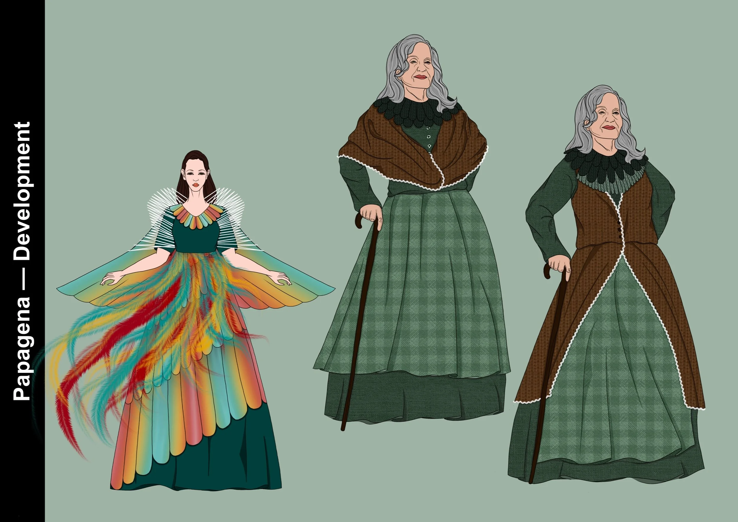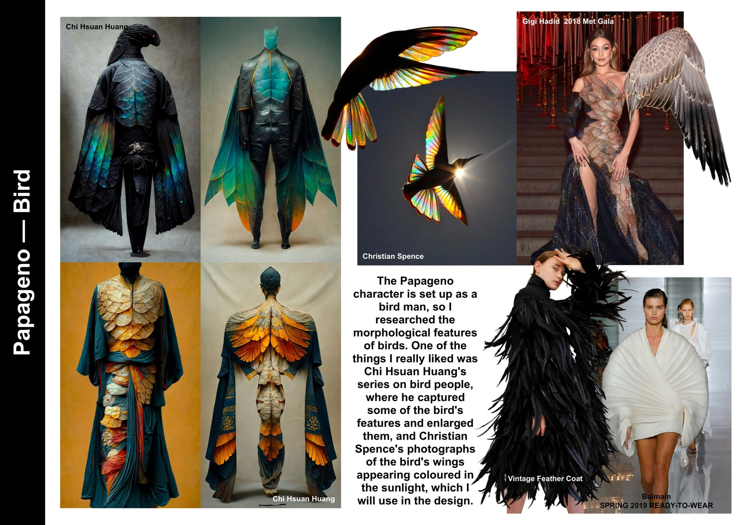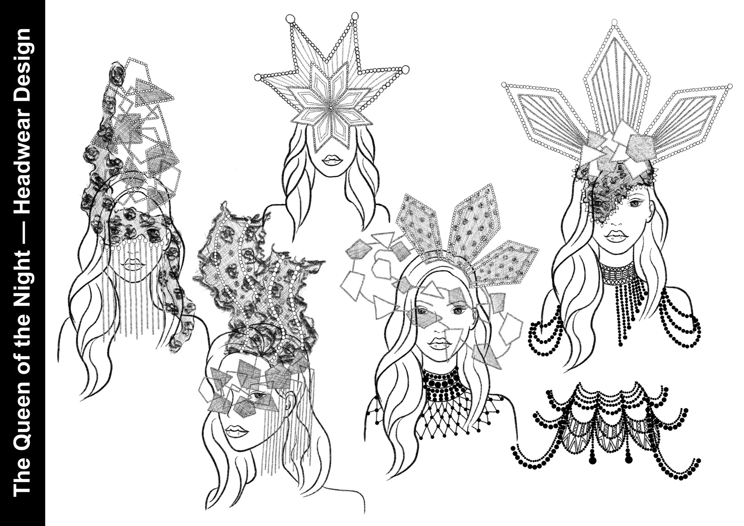 I designed the 5 characters in The Magic Flute. The Queen of the Night was inspired by diamonds illuminated by light in the darkness; Sarastro was inspired by Architectural Geometry; Tamino was Armour; and Papagene and Papagena were inspired by birds. Aseries of designs have been developed in conjunction with the Neoclassicism of fashion, and the production of The Queen of the Night's Costume.