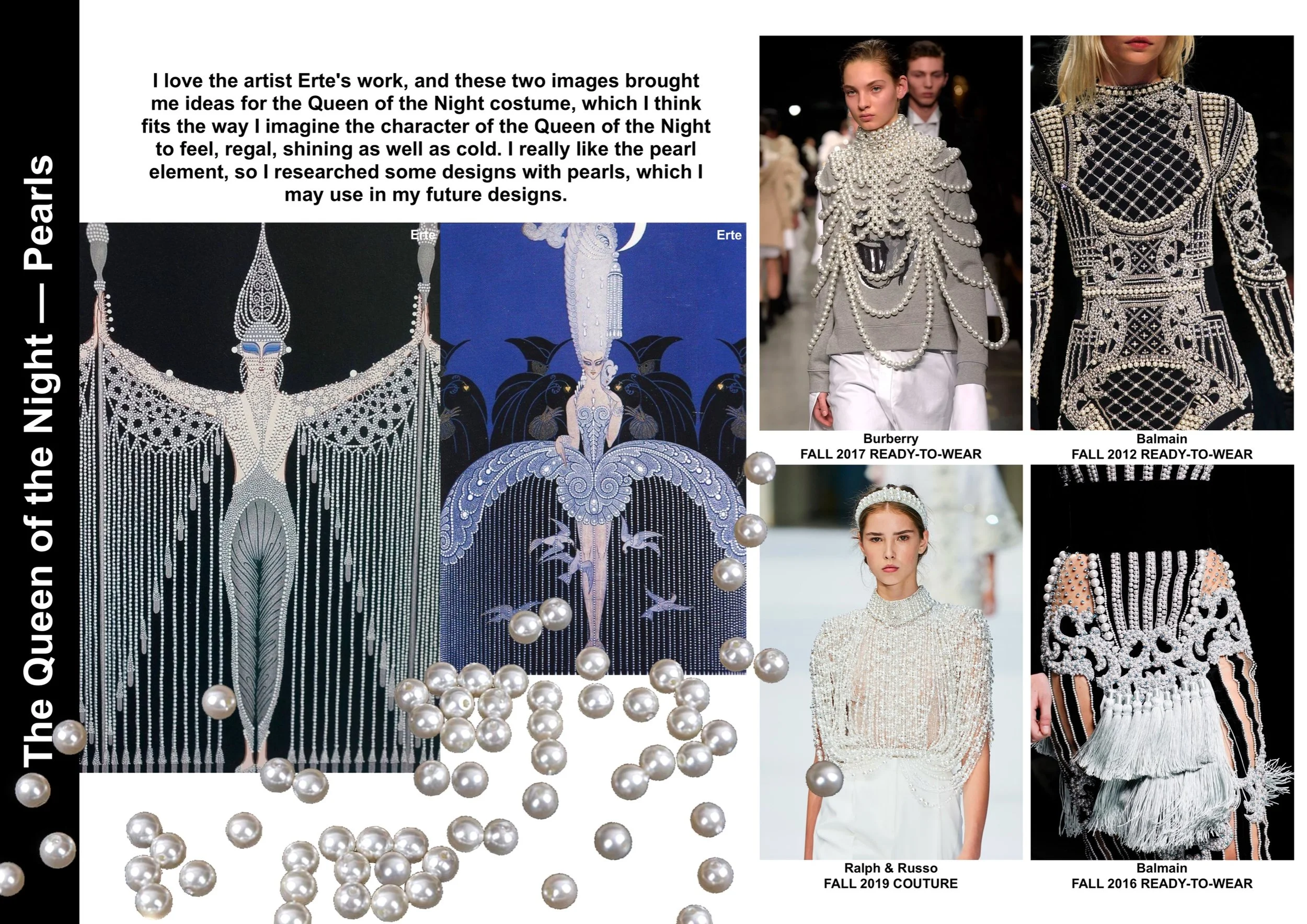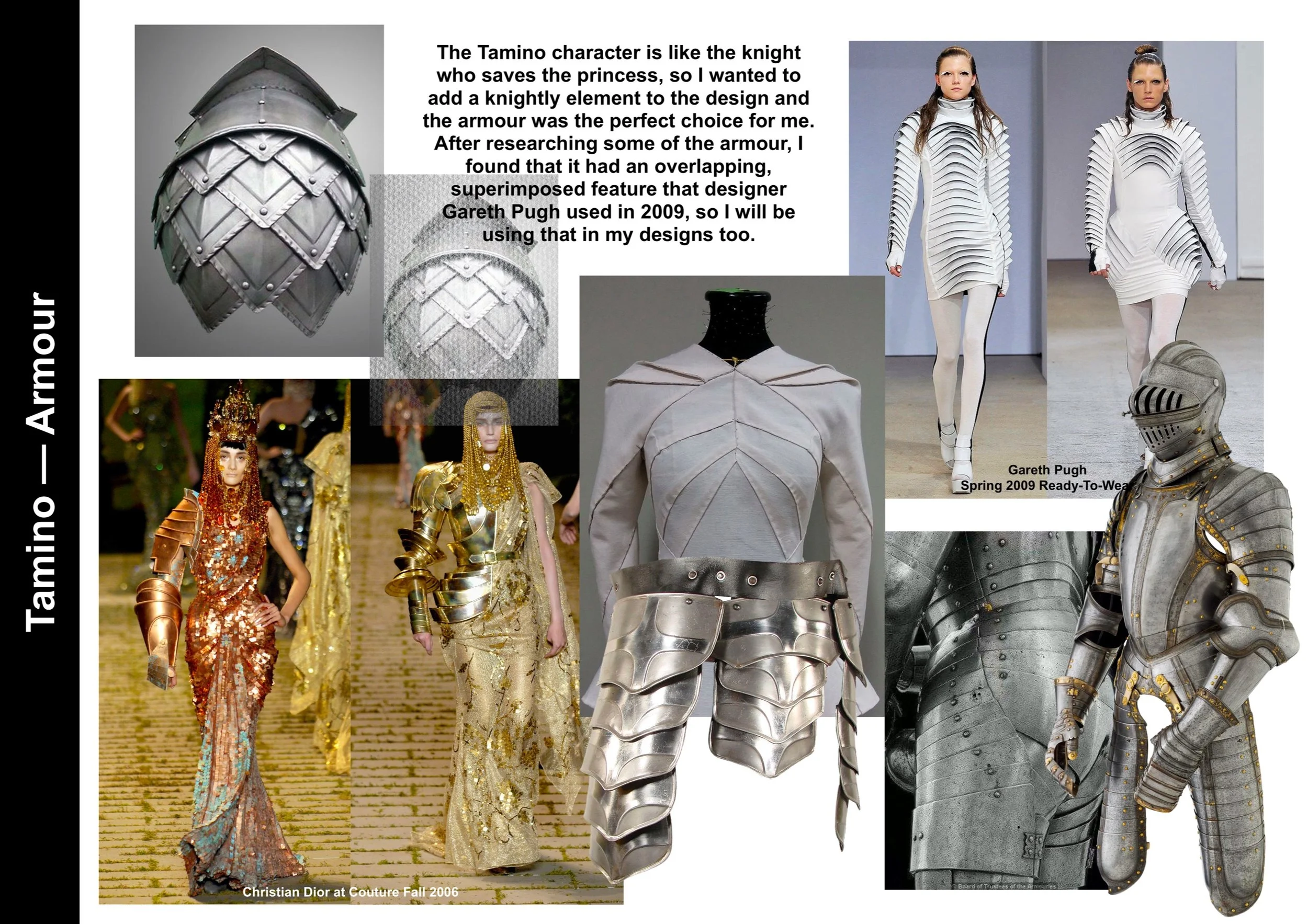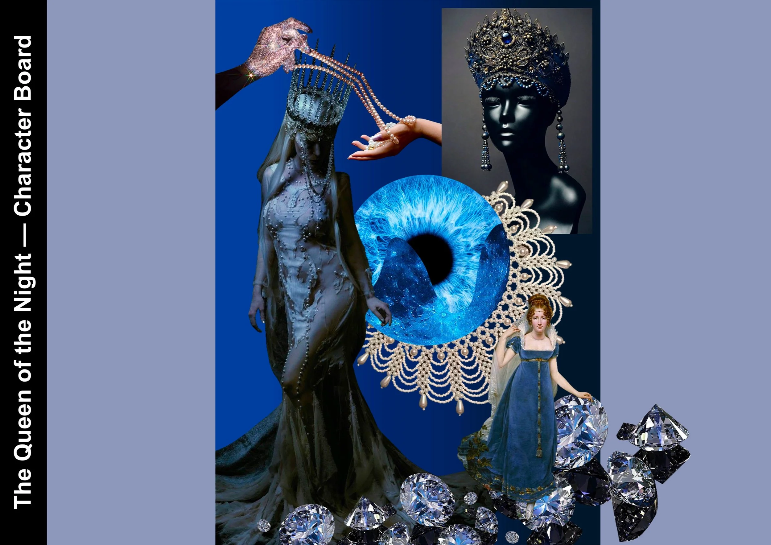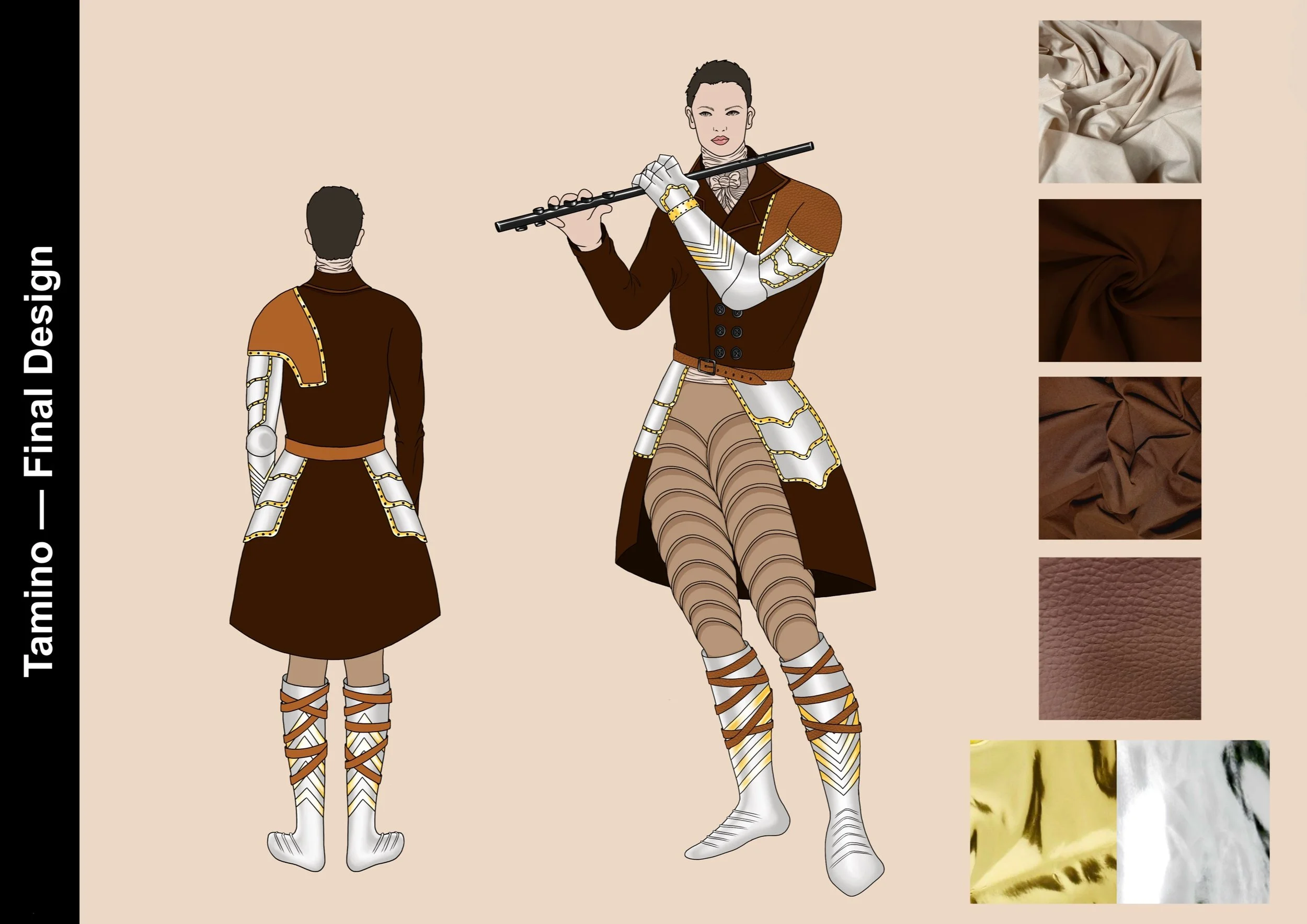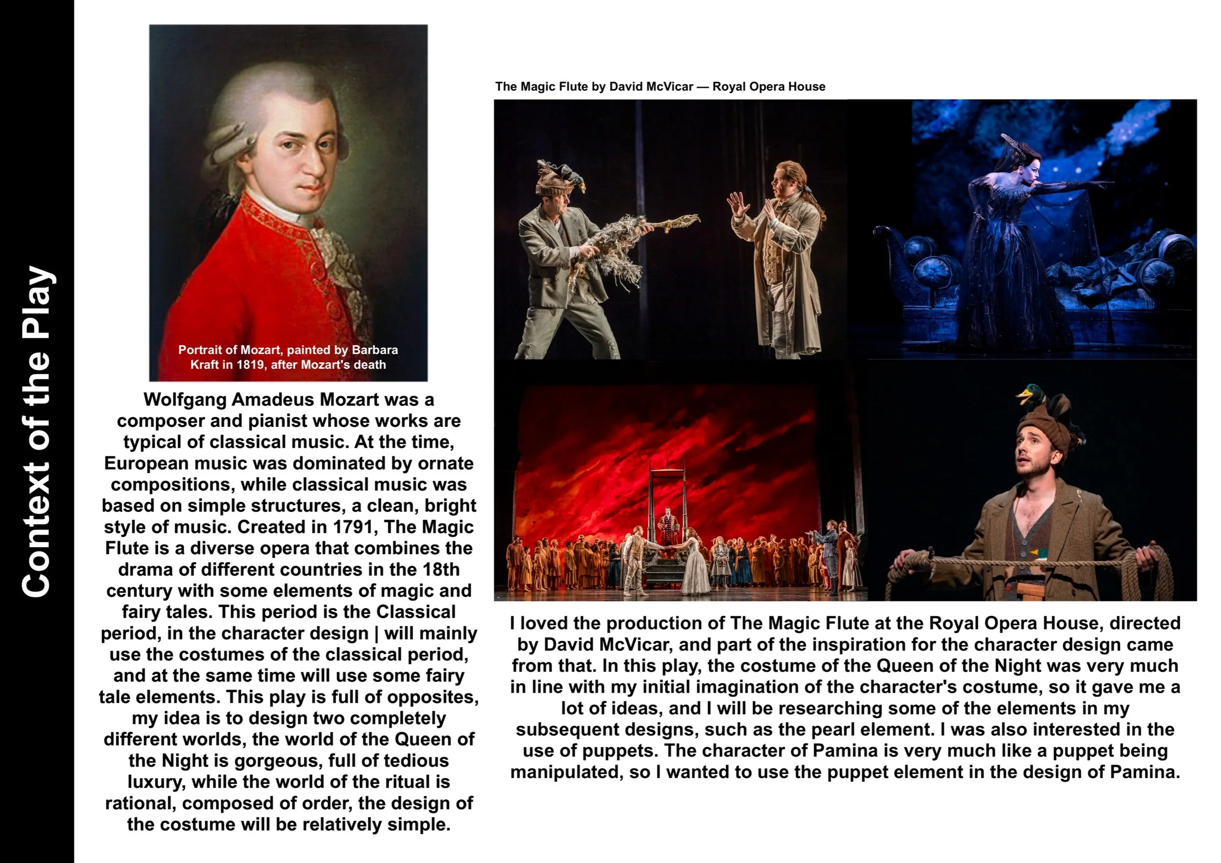 I designed the 5 characters in The Magic Flute. The Queen of the Night was inspired by diamonds illuminated by light in the darkness; Sarastro was inspired by Architectural Geometry; Tamino was Armour; and Papagene and Papagena were inspired by birds. Aseries of designs have been developed in conjunction with the Neoclassicism of fashion, and the production of The Queen of the Night's Costume.