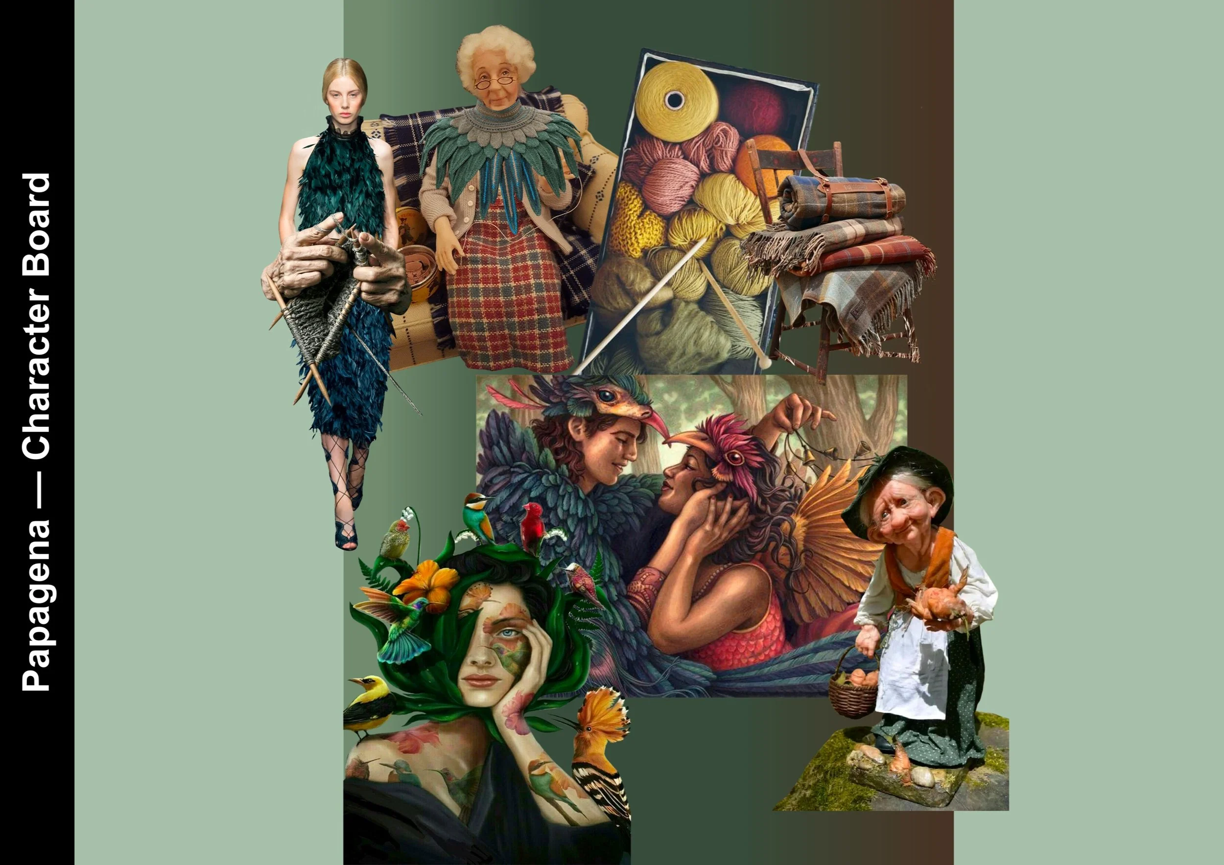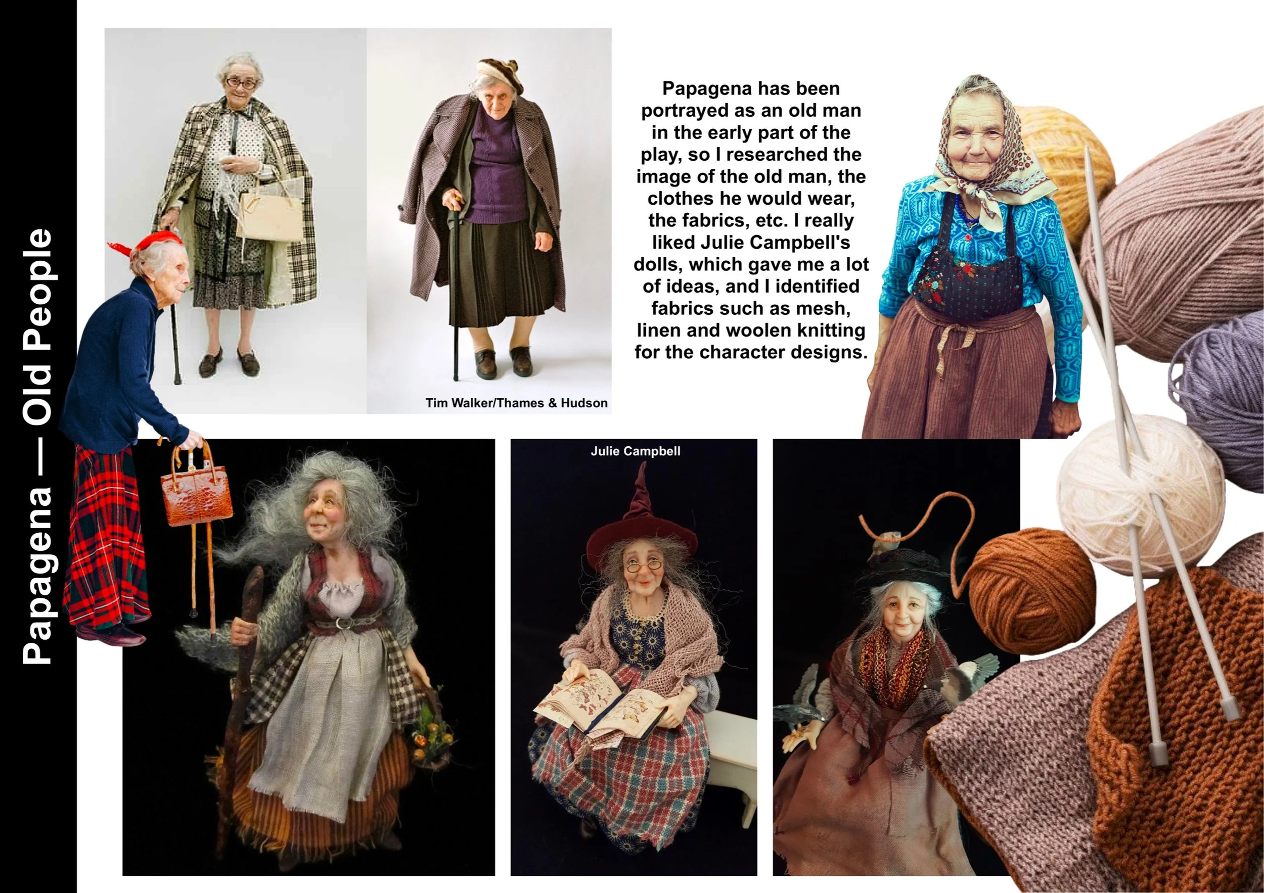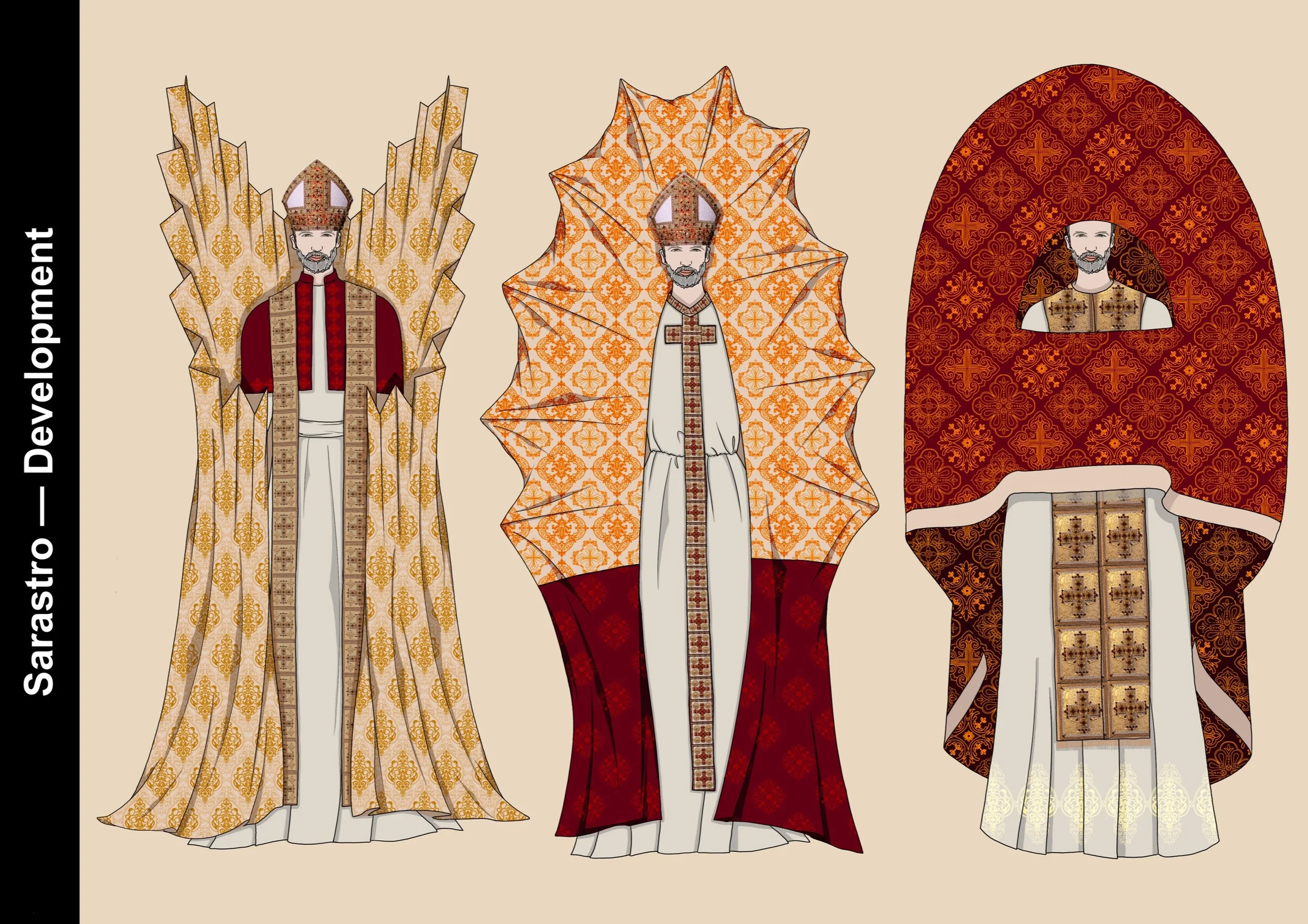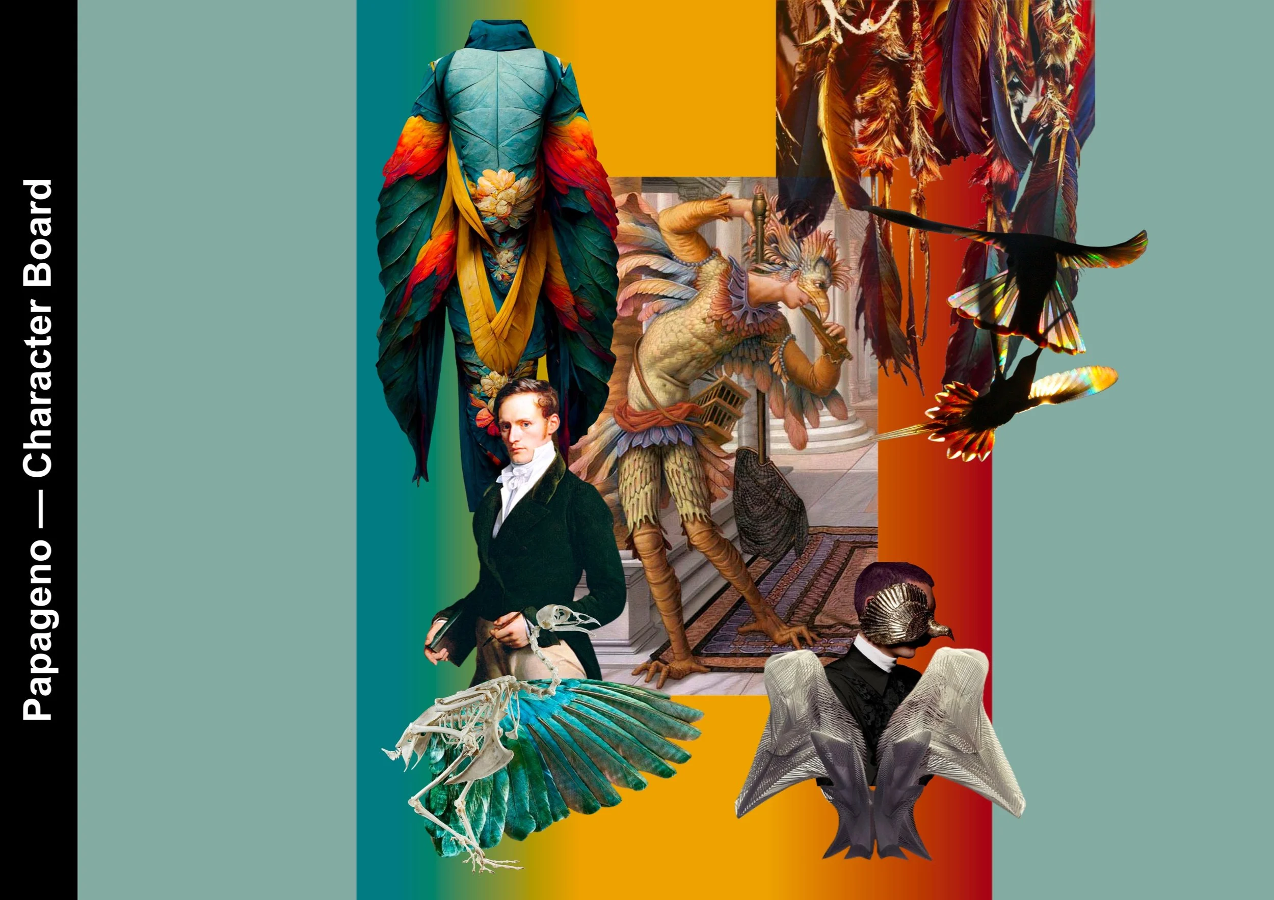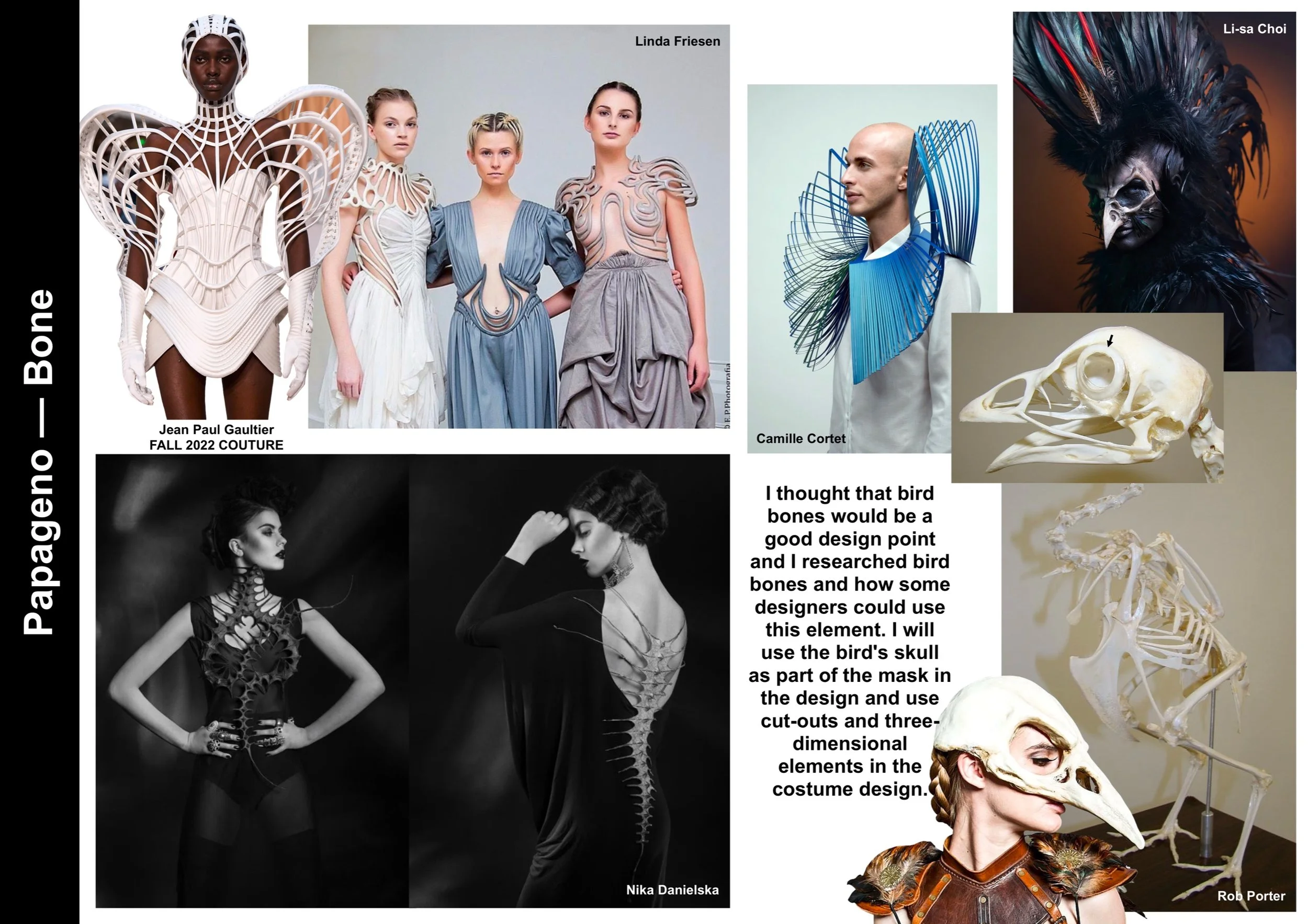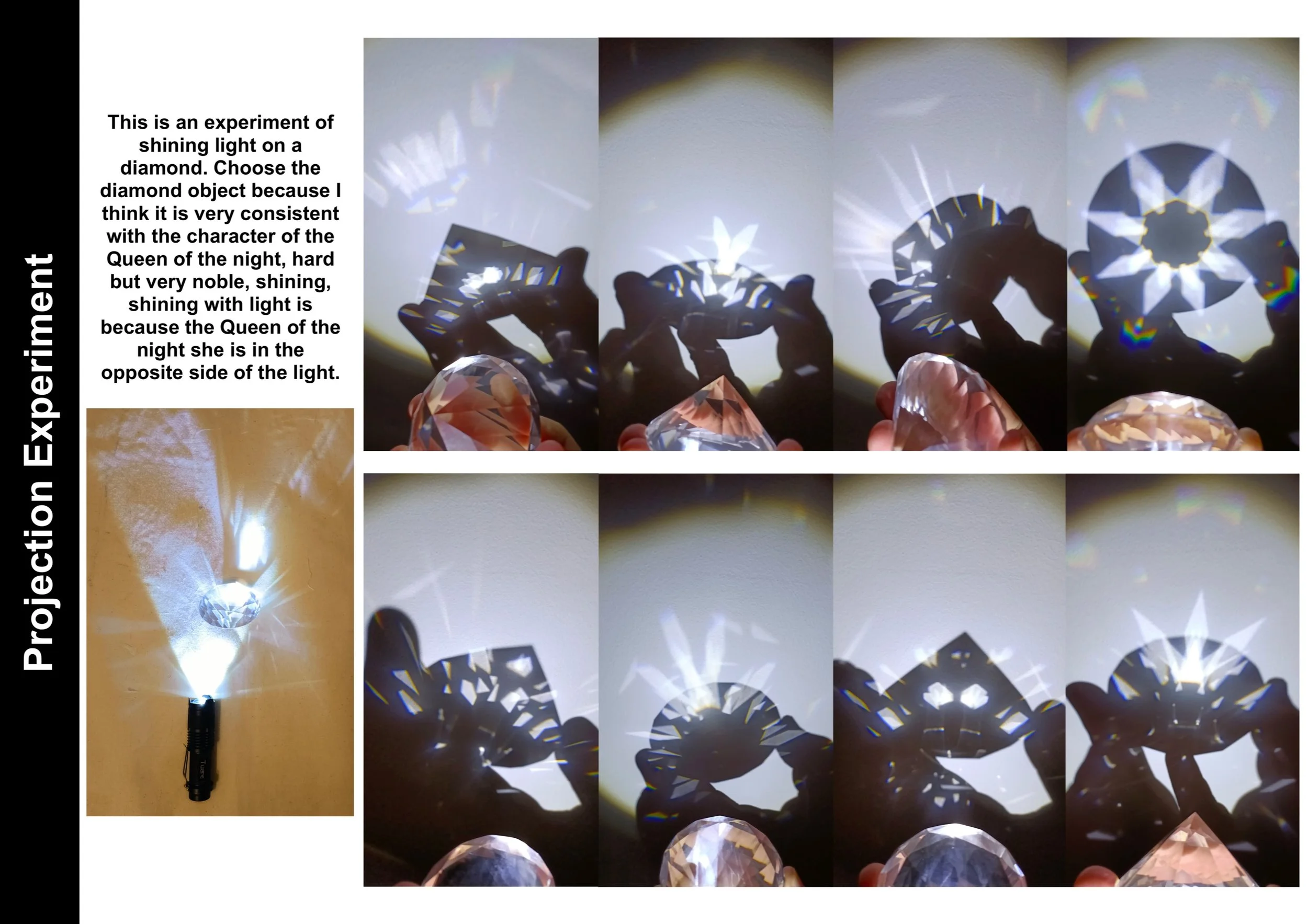 I designed the 5 characters in The Magic Flute. The Queen of the Night was inspired by diamonds illuminated by light in the darkness; Sarastro was inspired by Architectural Geometry; Tamino was Armour; and Papagene and Papagena were inspired by birds. Aseries of designs have been developed in conjunction with the Neoclassicism of fashion, and the production of The Queen of the Night's Costume.