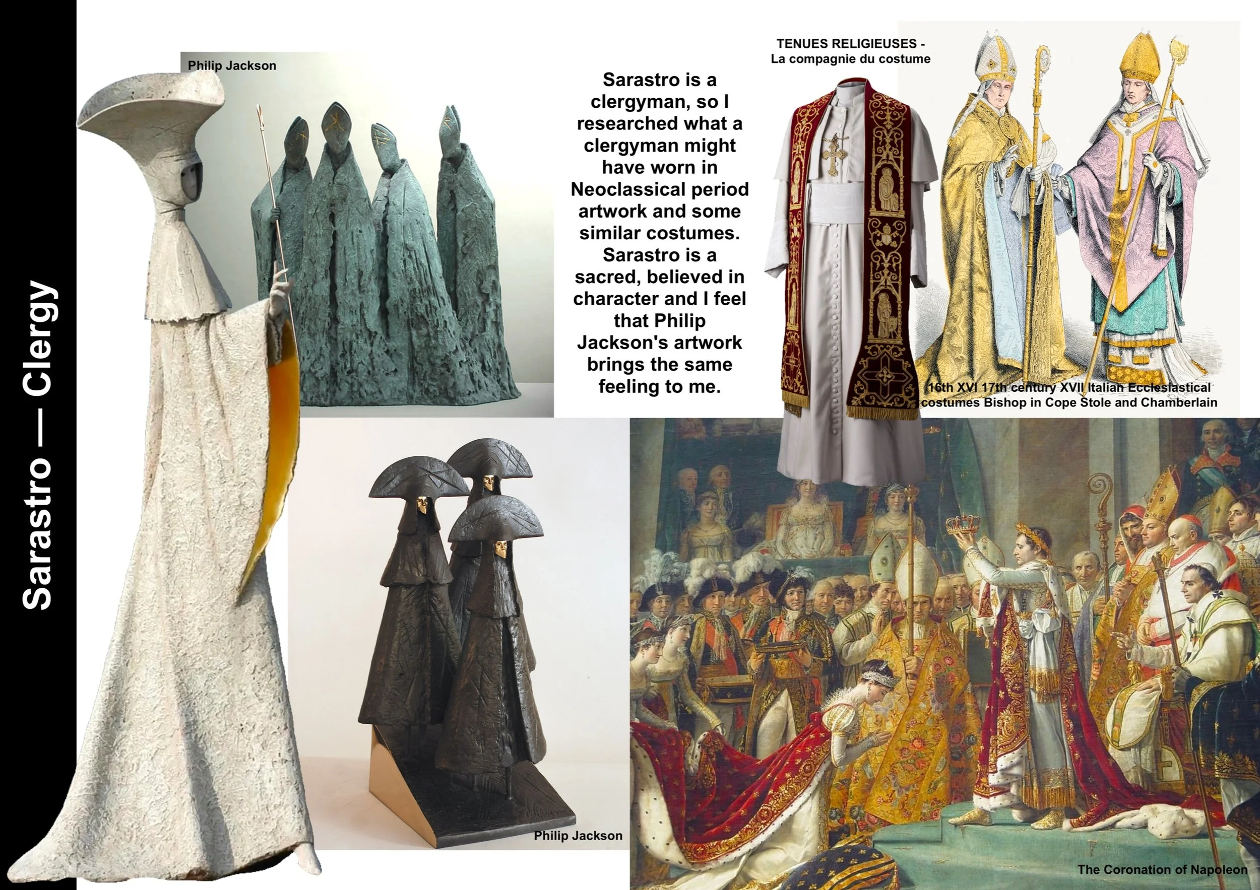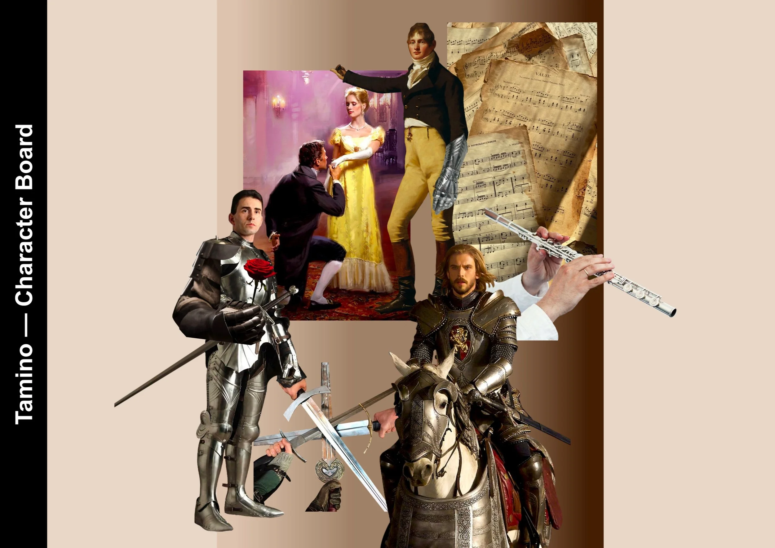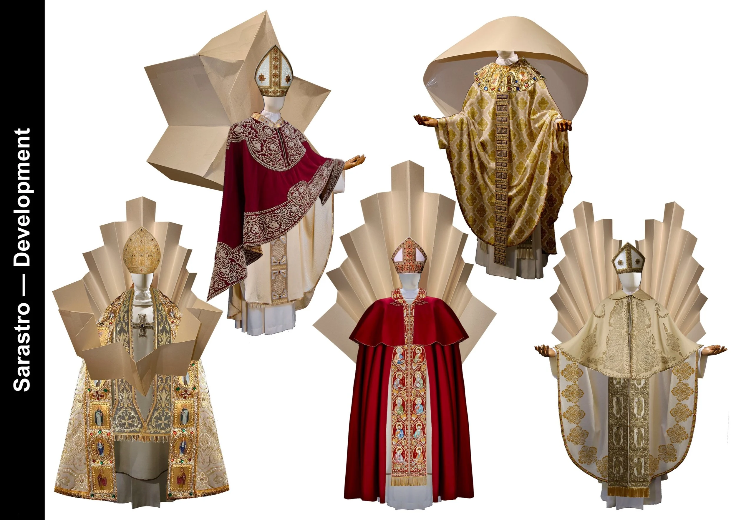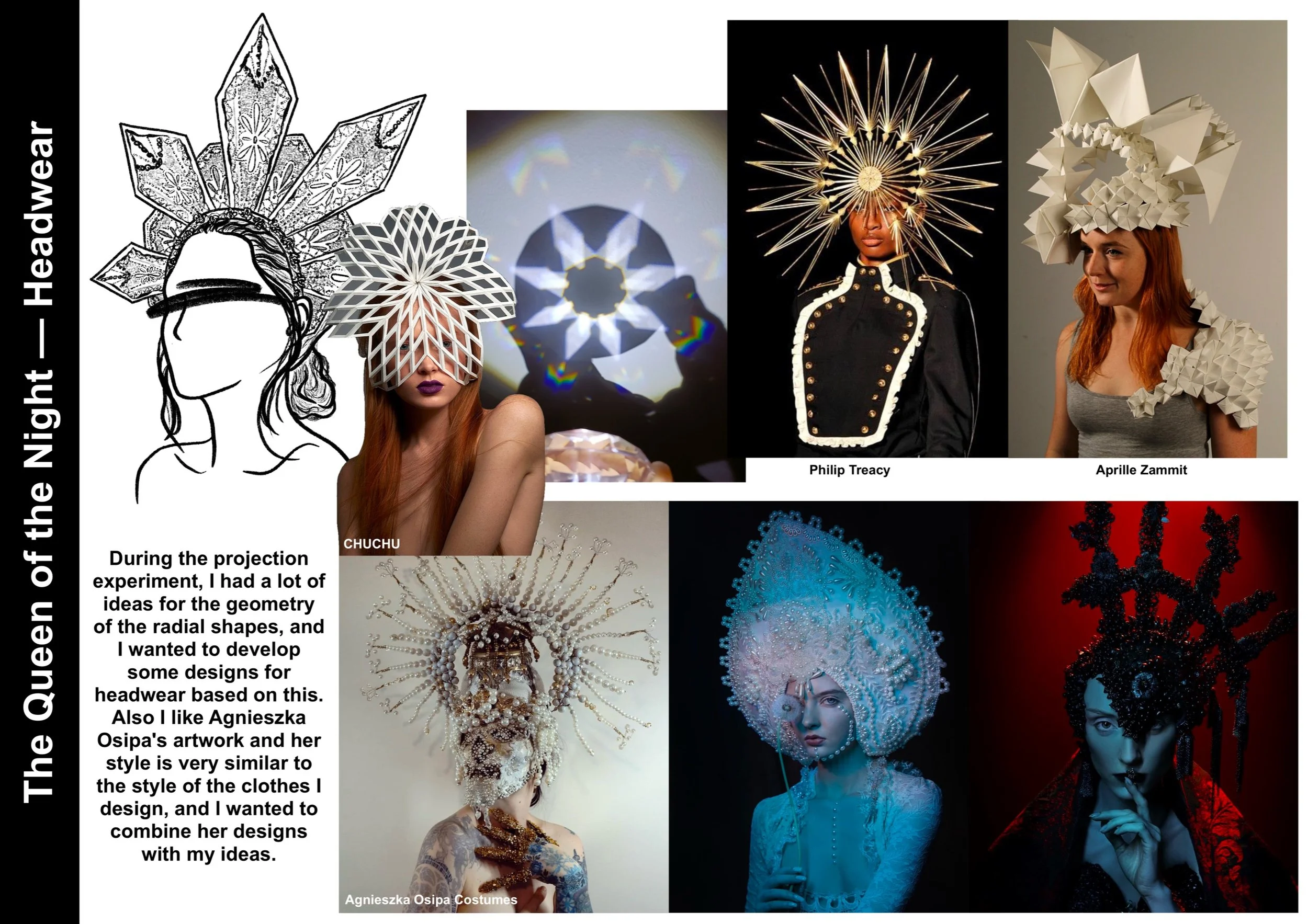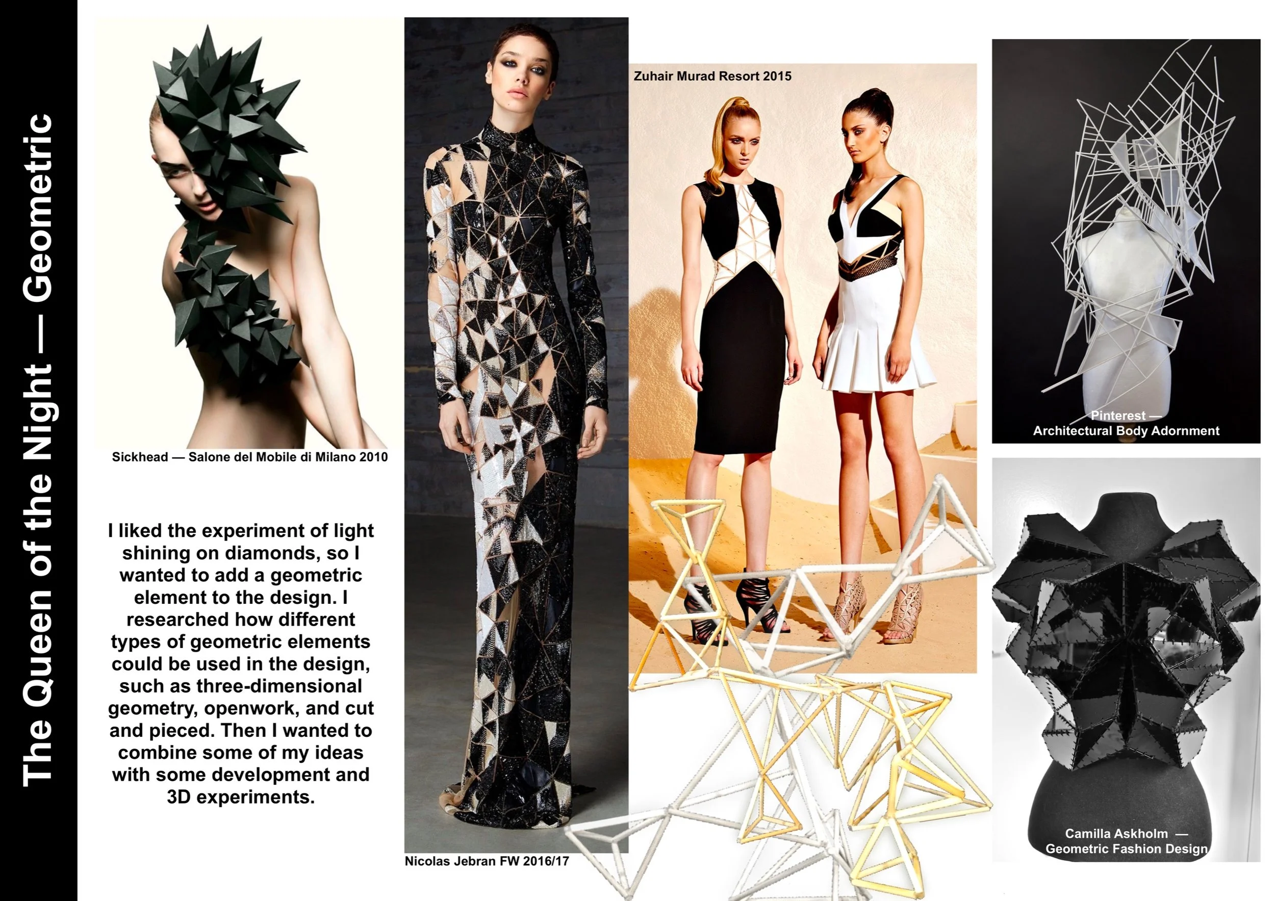 I designed the 5 characters in The Magic Flute. The Queen of the Night was inspired by diamonds illuminated by light in the darkness; Sarastro was inspired by Architectural Geometry; Tamino was Armour; and Papagene and Papagena were inspired by birds. Aseries of designs have been developed in conjunction with the Neoclassicism of fashion, and the production of The Queen of the Night's Costume.