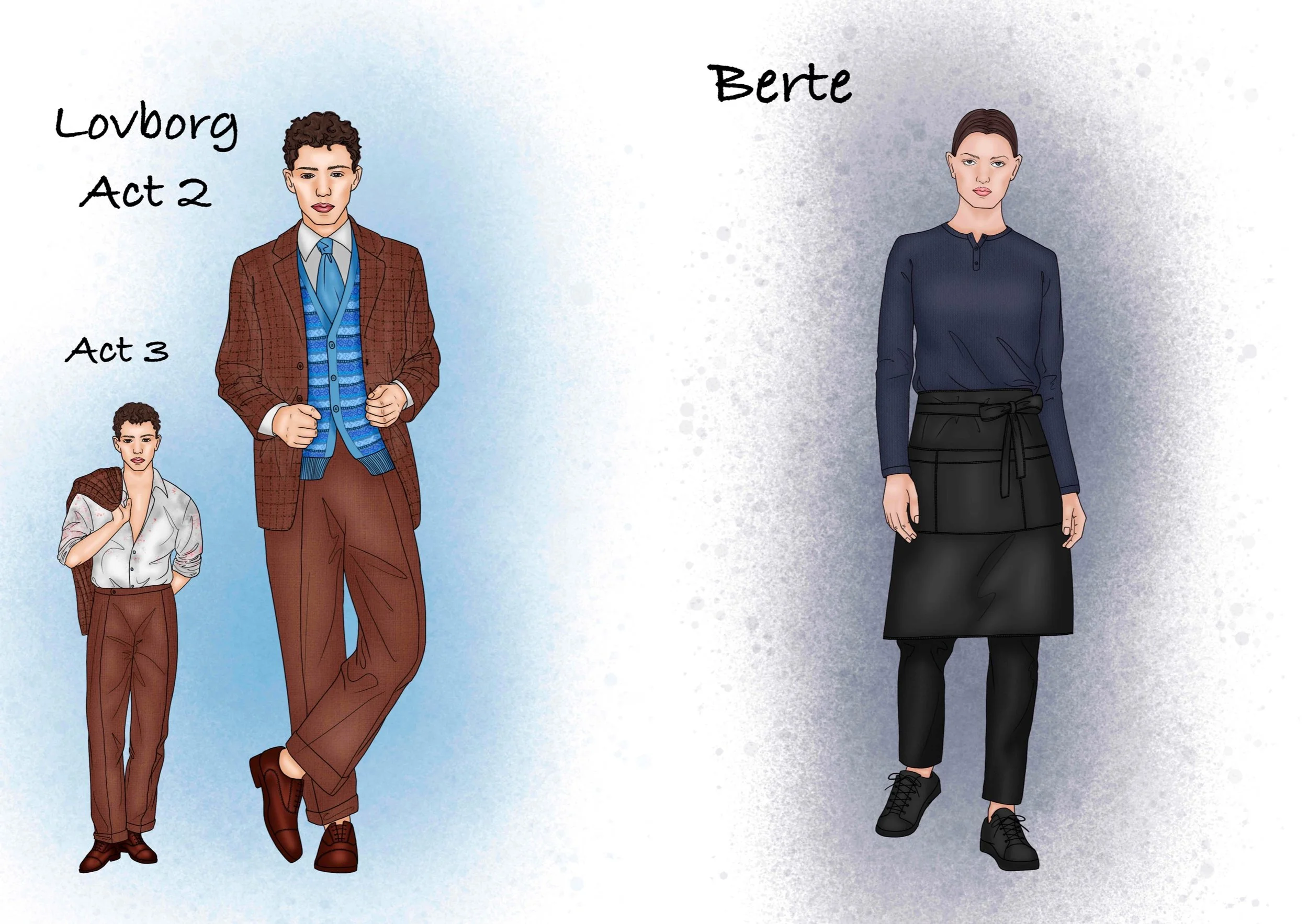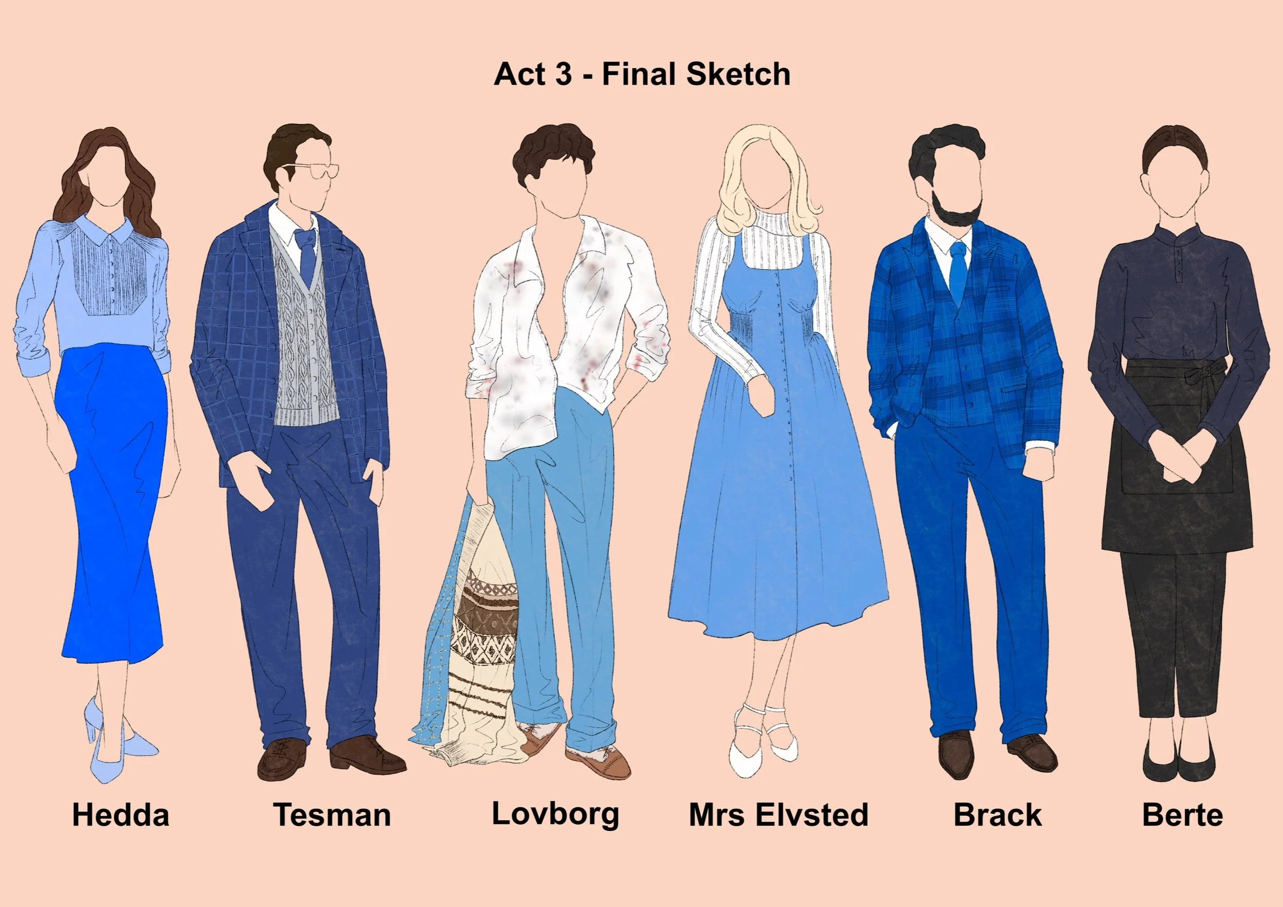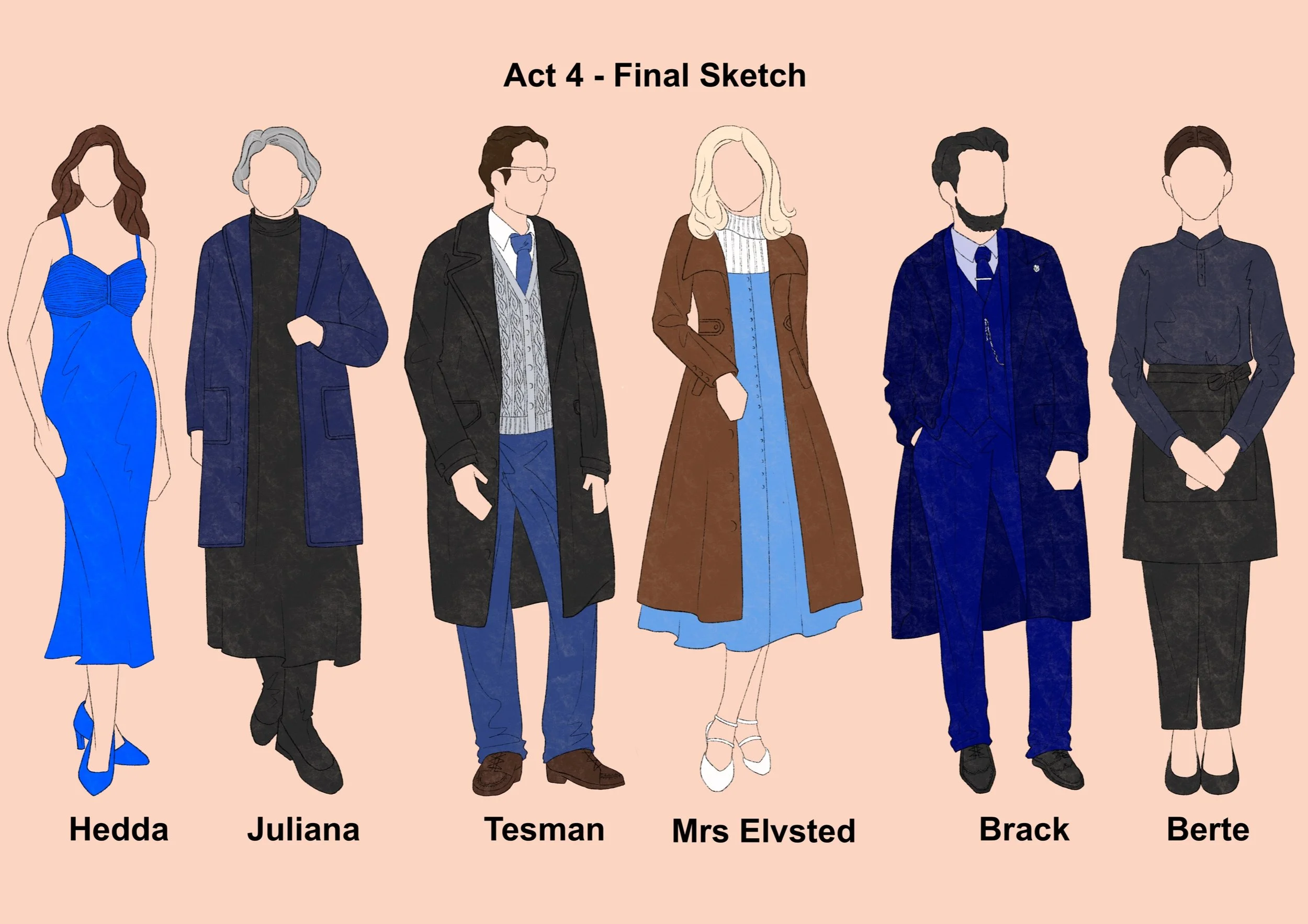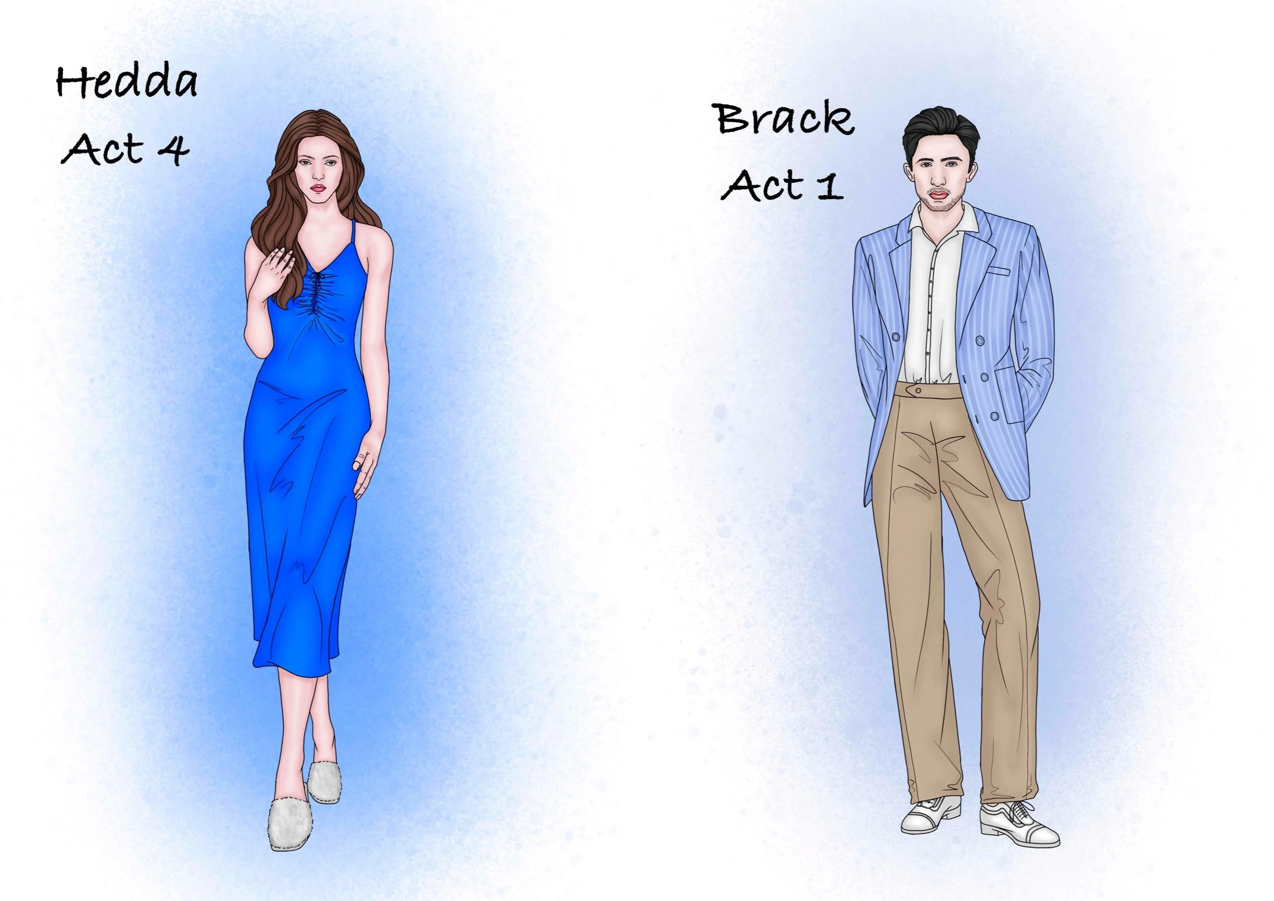 Hedda's period setting was changed to the current high society. Therefore the design is inspired by the current fashion and the social class of the character can be seen through the clothes. Hedda's character design is represented by the colour blue, which is calm, strong and sad, and is also used as a base.