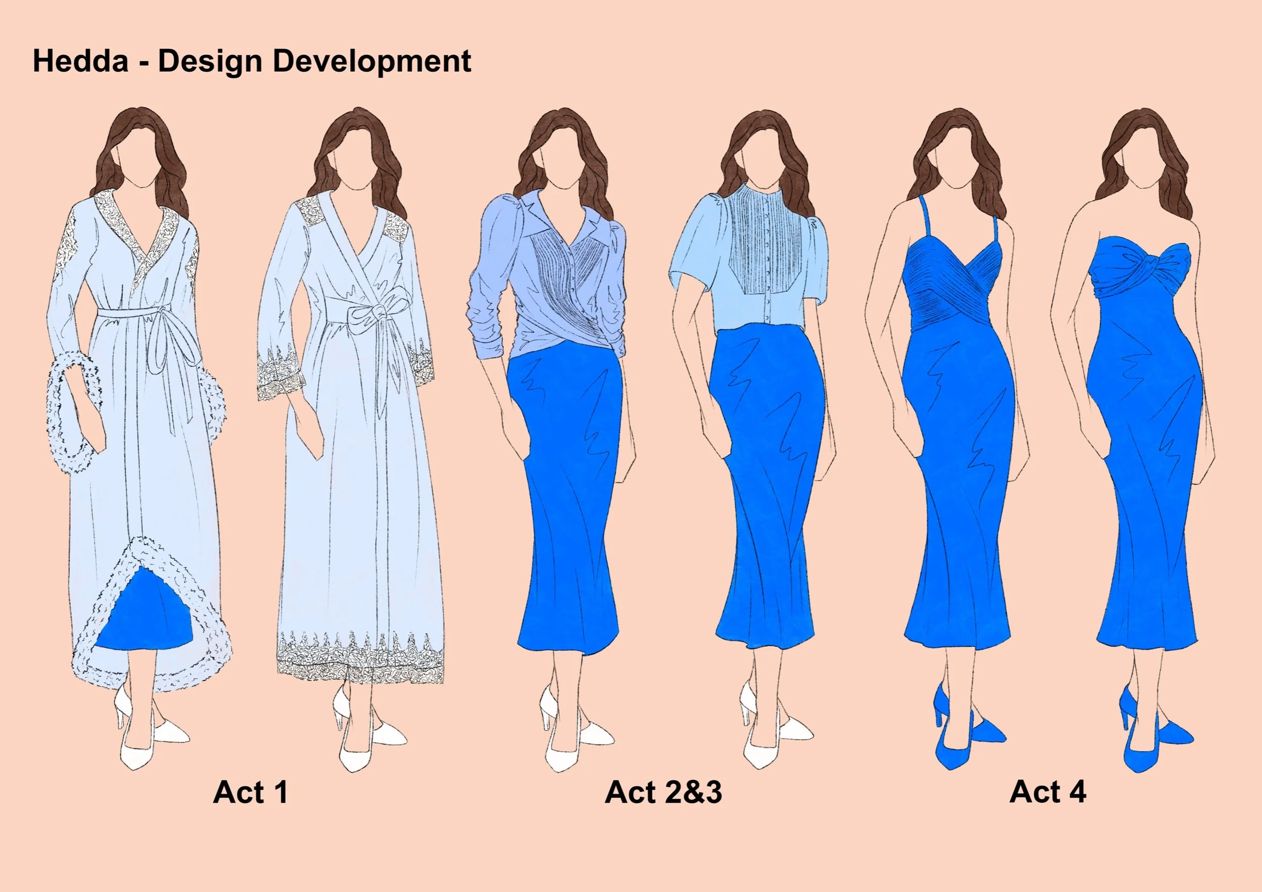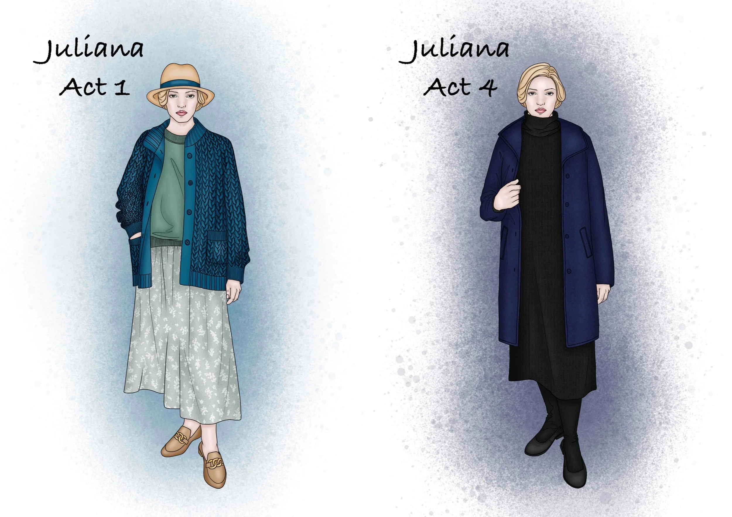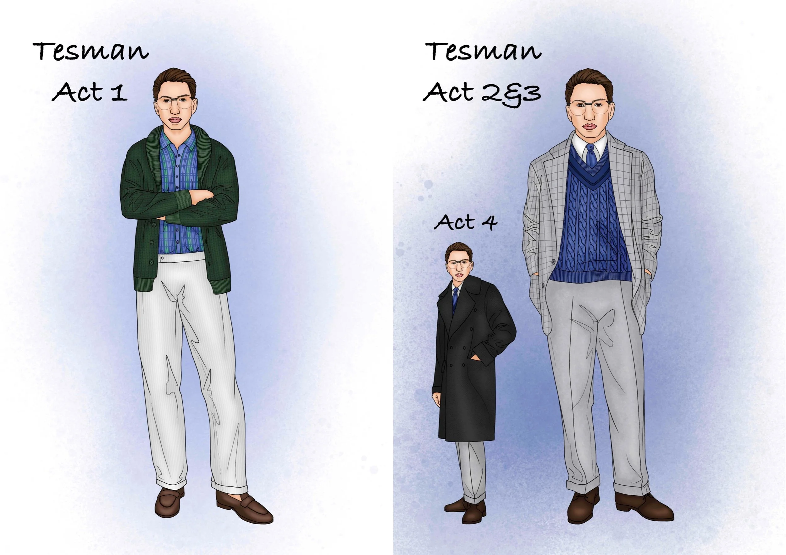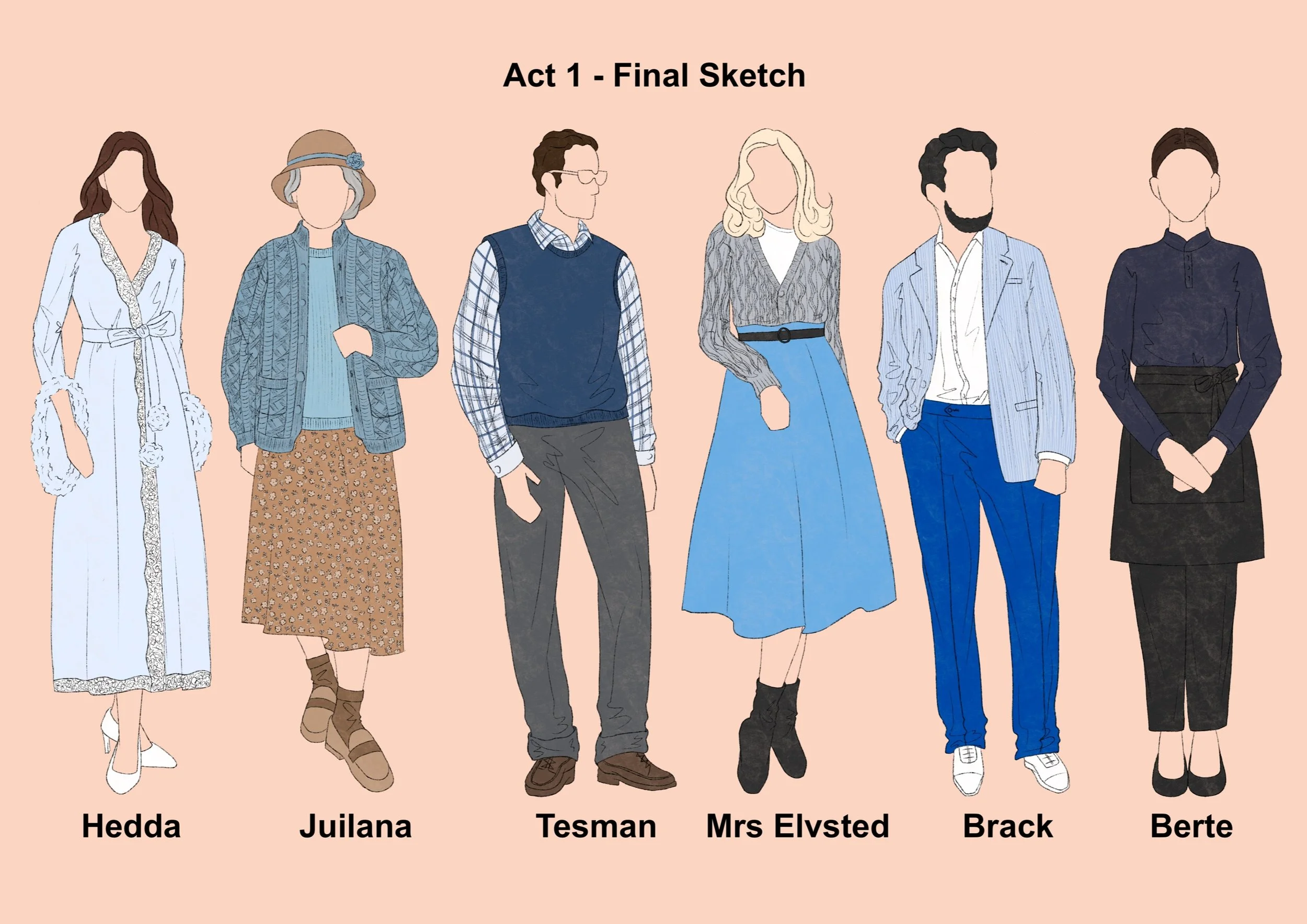 Hedda's period setting was changed to the current high society. Therefore the design is inspired by the current fashion and the social class of the character can be seen through the clothes. Hedda's character design is represented by the colour blue, which is calm, strong and sad, and is also used as a base.