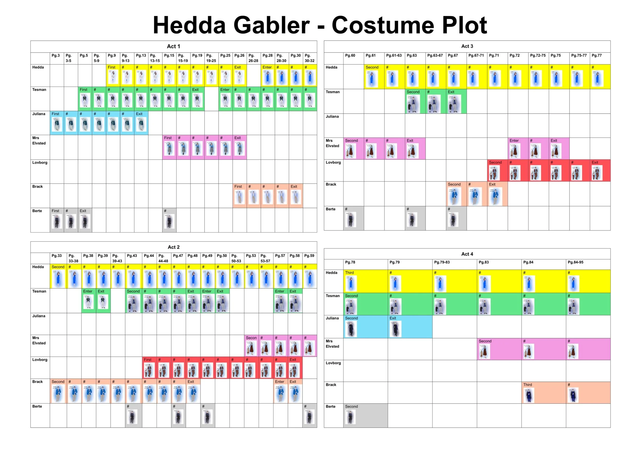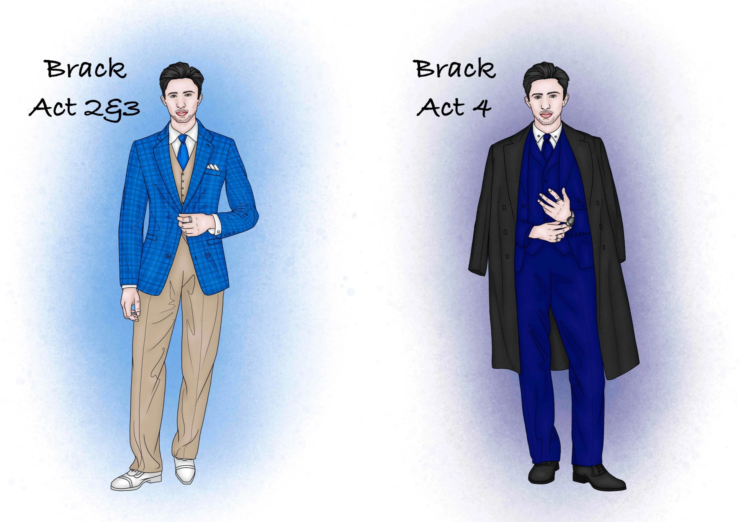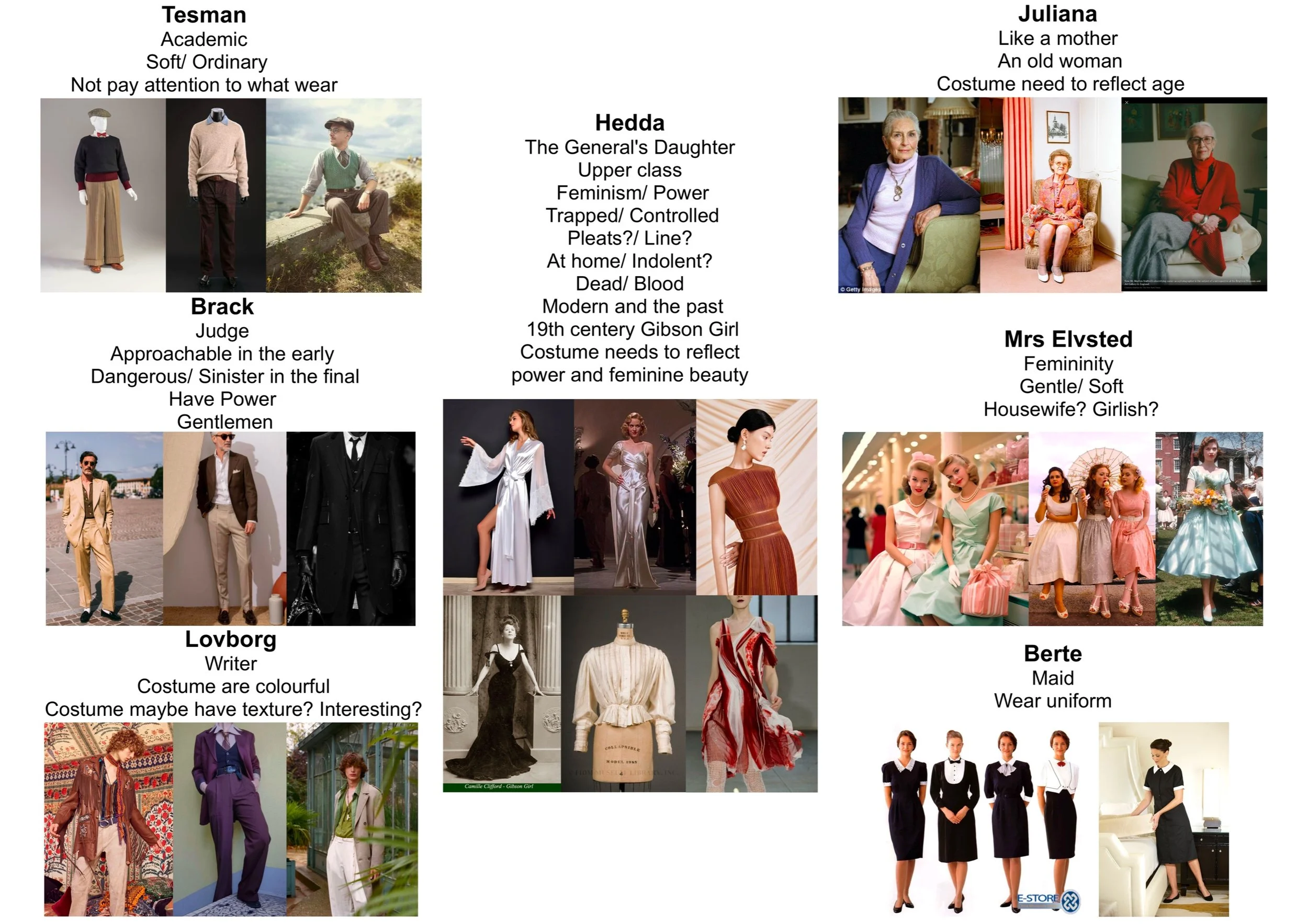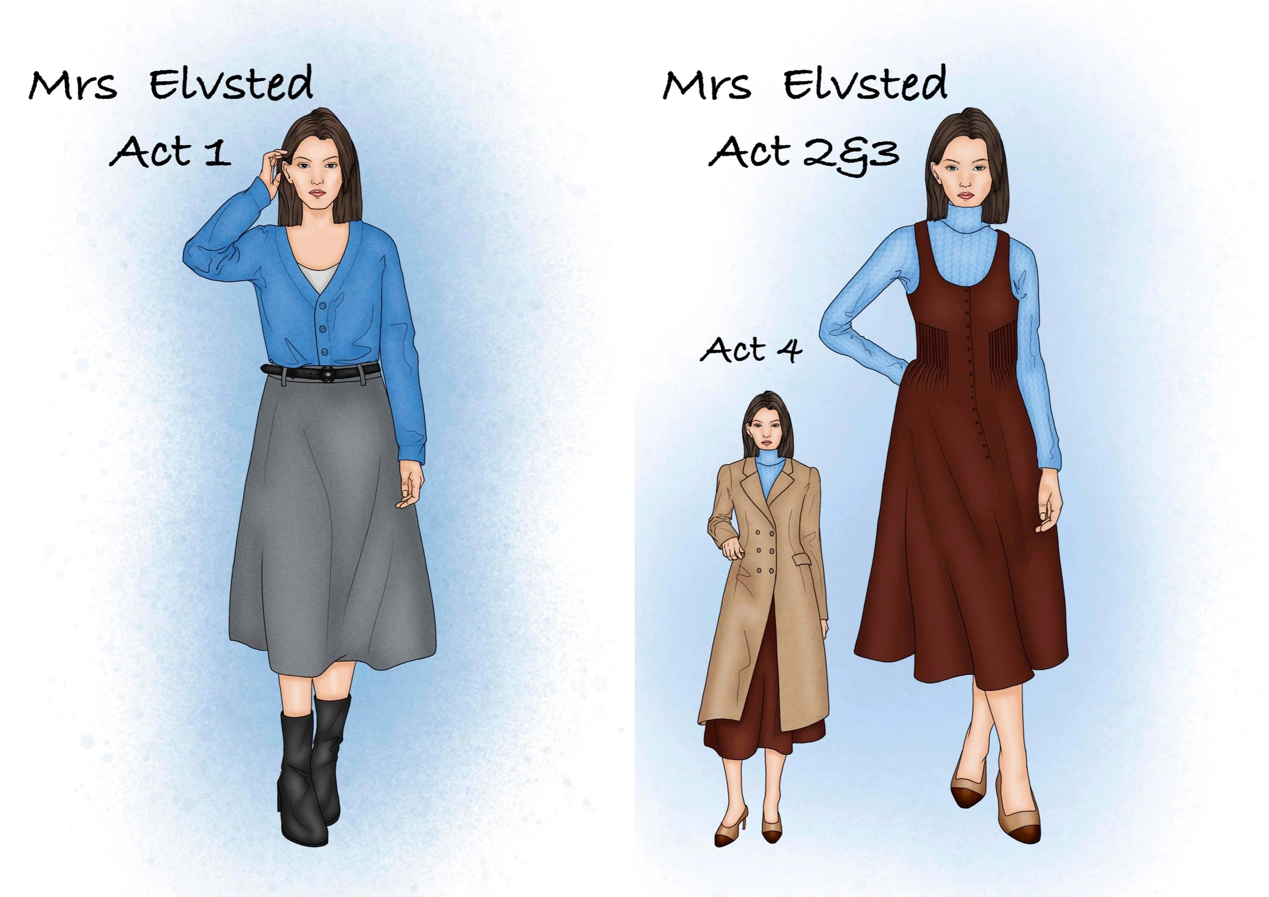 Hedda's period setting was changed to the current high society. Therefore the design is inspired by the current fashion and the social class of the character can be seen through the clothes. Hedda's character design is represented by the colour blue, which is calm, strong and sad, and is also used as a base.